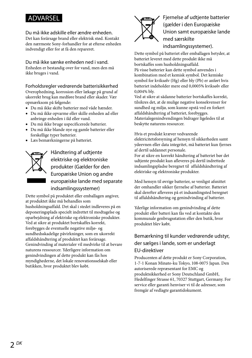 Producenten af dette produit er Sony Corporation, 1-7-1 Konan Minato-ku Tokyo, 108-0075 Japan. Den autoriserte representant for EMC og produitsikkerhed er Sony Deutschland GmbH, Hedelfinger Strasse 61, 70327 Stuttgart, Germany. For service erller garanti henviser vi til de adresser, som fremgår af vedlagte garantidokument.