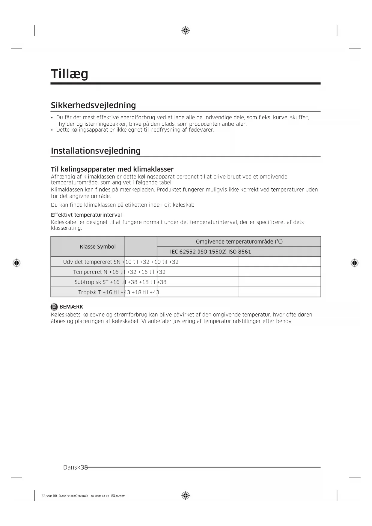 Udvidet tempereret SN +10 til +32 +10 til +32 Tempereret N +16 til +32 +16 til +32 Subtropisk ST +16 til +38 +18 til +38 Tropisk T +16 til +43 +18 til +43 BEMÆRK Køleskabets køleevne og strømforbrug kan blive påvirket af den omgivende temperatur, hvor ofte døren åbnes og placeringen af køleskabet. Vi anbefaler justering af temperaturindstillinger efter behov. RR7000_RR_DA68-04283C-00.indb 38 2020-12-16 3:29:39Dansk 39 Temperaturvejledning Anbefalet temperatur Den optimale temperaturindstilling til opbevaring af mad: