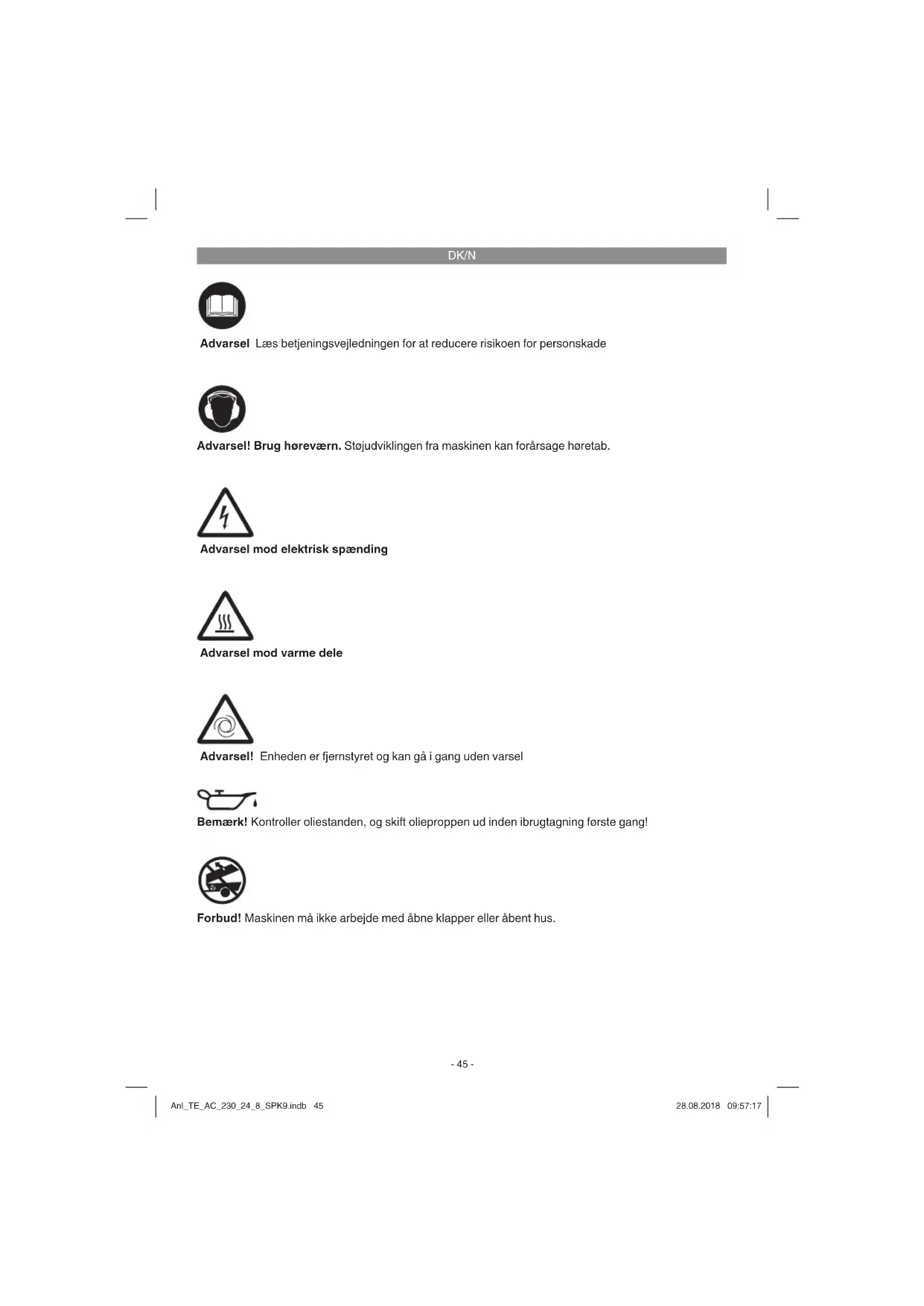 Advarsel mod elektrisk spænding Advarsel mod varme dele Advarsel! Enheden er fjernstyret og kan gå i gang uden varsel Bemærk! Kontroller oliestanden, og skift olieproppen ud inden ibrugtagning første gang! Forbud! Maskinen må ikke arbejde med åbne klapper eller åbent hus. Advarsel! Brug høreværn. Støjudviklingen fra maskinen kan forårsage høretab. Advarsel Læs betjeningsvejledningen for at reducere risikoen for personskade Anl_TE_AC_230_24_8_SPK9.indb 45Anl_TE_AC_230_24_8_SPK9.indb 45 28.08.2018 09:57:1728.08.2018 09:57:17DK/N