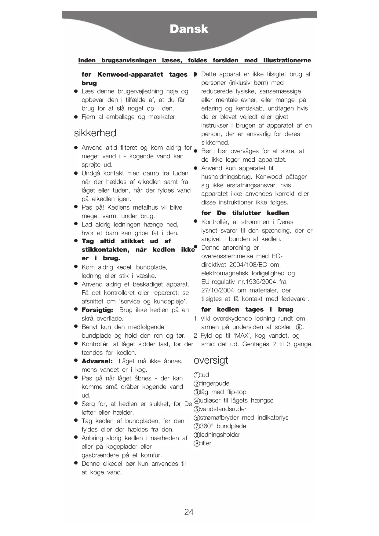 Anvend kun apparatet til husholdningsbrug. Kenwood påtager sig ikke erstatningsansvar, hvis apparatet ikke anvendes korrekt eller disse instruktioner ikke følges. før De tilslutter kedlen