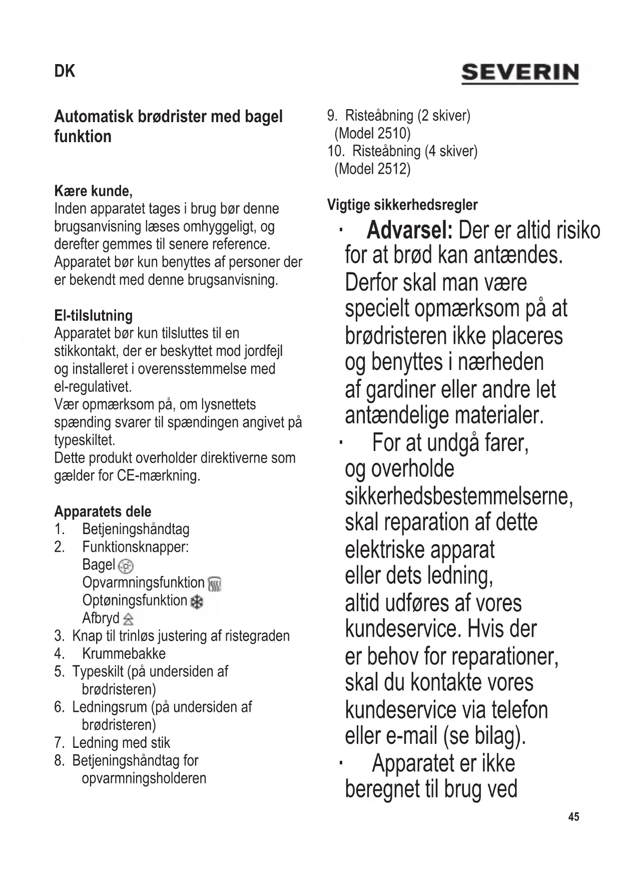 (Model 2512) Vigtige sikkerhedsregler ∙ Advarsel: Der er altid risiko for at brød kan antændes. Derfor skal man være specielt opmærksom på at brødristeren ikke placeres og benyttes i nærheden af gardiner eller andre let antændelige materialer. ∙ For at undgå farer, og overholde sikkerhedsbestemmelserne