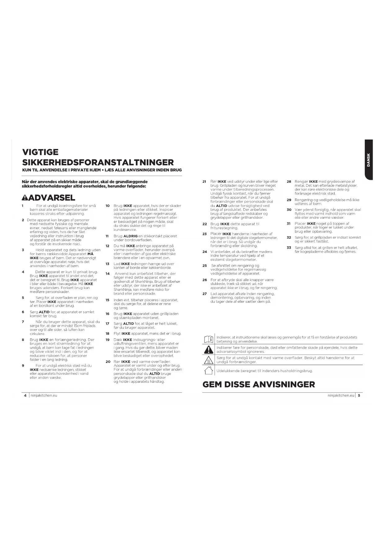 ninjakitchen.eu Scan QR-koden med en mobilenhed DANSKVIGTIGE SIKKERHEDSFORANSTALTNINGER KUN TIL ANVENDELSE I PRIVATE HJEM • LÆS ALLE ANVISNINGER INDEN BRUG Når der anvendes elektriske apparater, skal de grundlæggende sikkerhedsforholdsregler altid overholdes, herunder følgende: ADVARSEL 1 For at undgå kvælningsfare for små børn skal alle emballagematerialer kasseres straks efter udpakning. 2 Dette apparat kan bruges af personer med nedsatte fysiske og mentale evner, nedsat følesans eller manglende erfaring og viden, hvis de har fået vejledning eller instruktion i brug af apparatet på en sikker måde og forstår de involverede risici. 3 Hold apparatet og dets ledning uden for børns rækkevidde.Apparatet MÅ IKKE bruges af børn. Det er nødvendigt at overvåge apparatet nøje, hvis det anvendes i nærheden af børn. 4 Dette apparat er kun til privat brug. Brug IKKE apparatet til andet end det, det er beregnet til. Brug IKKE apparatet i biler eller både i bevægelse. Må IKKE bruges udendørs. Forkert brug kan medføre personskader. 5 Sørg for, at overfladen er plan, ren og tør. Placer IKKE apparatet i nærheden af en bordkant under brug. 6 Sørg ALTID for, at apparatet er samlet korrekt før brug. 7 Når du bruger dette apparat, skal du sørge for, at der er mindst 15cm friplads over og til alle sider, så luften kan cirkulere. 8 Brug IKKE en forlængerledning. Der bruges en kort strømledning for at undgå, at børn kan tage fat i ledningen og blive viklet ind i den, og for at reducere risikoen for, at personer falder i en lang ledning. 9 For at undgå elektrisk stød må du IKKE nedsænke ledningen, stikket eller apparatets hovedenhed i vand eller anden væske. 10 Brug IKKE apparatet, hvis der er skader på ledningen eller stikket. Inspicer apparatet og ledningen regelmæssigt. Hvis apparatet fungerer forkert eller er beskadiget på nogen måde, skal du straks slukke det og ringe til kundeservice. 11 Brug ALDRIG en stikkontakt placeret under bordoverfladen. 12 Du må IKKE anbringe apparatet på varme overflader, herunder ovenpå eller i nærheden af gas eller elektriske brændere eller i en opvarmet ovn. 13 Lad IKKE ledningen hænge ud over kanten af borde eller køkkenborde. 14 Anvend kun anbefalet tilbehør, der følger med dette apparat eller er godkendt af SharkNinja. Brug af tilbehør eller udstyr, der ikke er anbefalet af SharkNinja, kan medføre risiko for brand eller personskade. 15 Inden evt. tilbehør placeres i apparatet, skal du sørge for, at delene er rene og tørre. 16 Brug IKKE apparatet uden grilllpladen og stænkpladen monteret. 17 Sørg ALTID for, at låget er helt lukket, før du bruger apparatet. 18 Flyt IKKE apparatet, mens det er i brug. 19 Dæk IKKE indsugnings- eller udluftningsventilen, mens apparatet er i gang. Hvis du gør dette, bliver maden ikke ensartet tilberedt, og apparatet kan blive beskadiget eller overophedet. 20 Rør IKKE ved varme overflader. Apparatet er varmt under og efter brug. For at undgå forbrændinger eller anden personskade skal du ALTID bruge grydelapper eller grillhandsker og holde i apparatets håndtag.