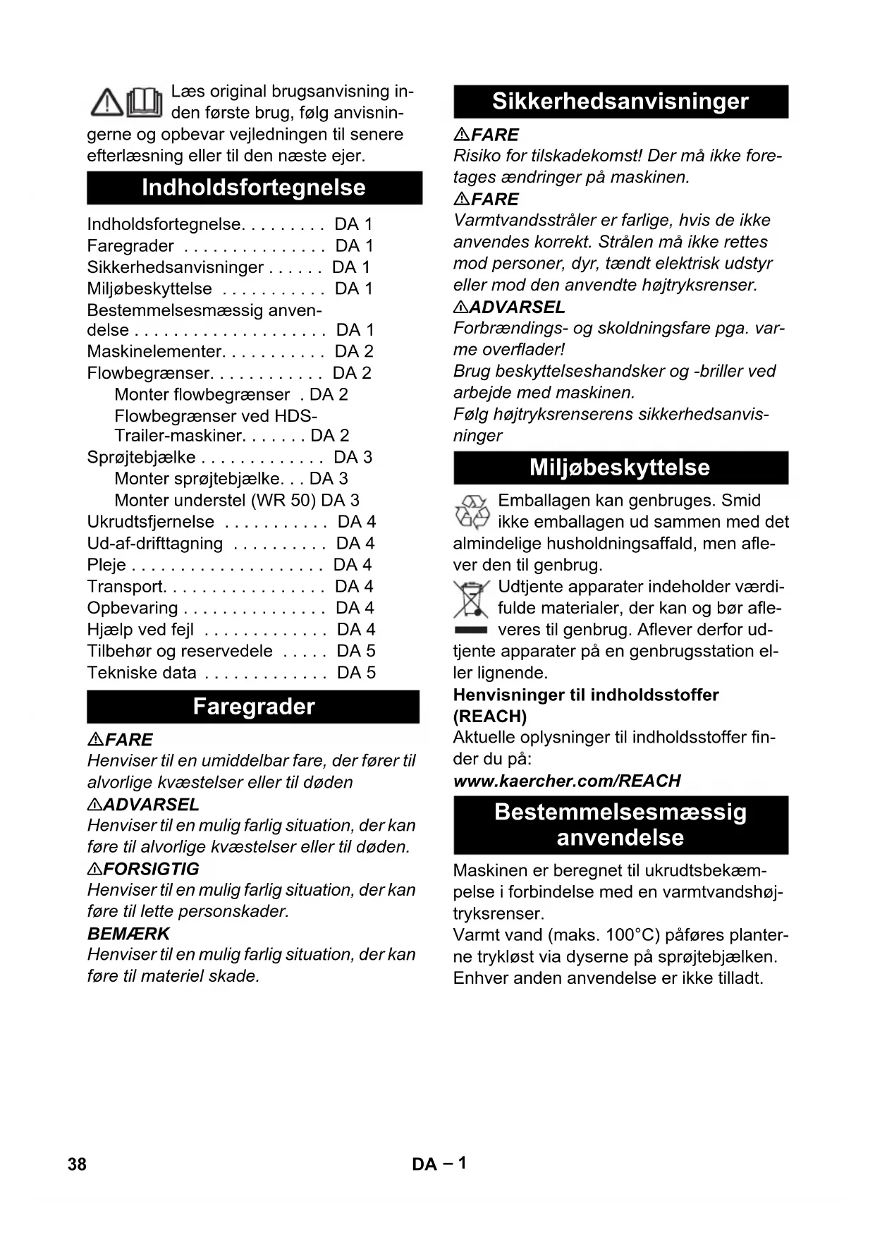 Verificar se o eixo da roda e os rola- mentos das rodas estão sujos. Utilizar apenas acessórios e peças sobres- salentes originais. Só assim poderá garan- tir uma operação do aparelho segura e sem avarias. Para mais informações sobre acessórios e peças sobressalentes, consulte www.kaer- cher.com. Ajuda em caso de avarias Acessórios e peças sobressalentes Dados técnicos WR 20 WR 50 Largura de trabalho 200mm 500mm Temperatura mín. de admissão 90° C Temperatura de ali- mentação máx. 100° C Quantidade de admis- são l/min 5,8 - 8,3 8,3 - 16,7 Peso (kg) 0,3 2,2 37PT– 1 Læs original brugsanvisning in- den første brug, følg anvisnin- gerne og opbevar vejledningen til senere efterlæsning eller til den næste ejer. FARE Henviser til en umiddelbar fare, der fører til alvorlige kvæstelser eller til døden 몇 ADVARSEL Henviser til en mulig farlig situation, der kan føre til alvorlige kvæstelser eller til døden. 몇 FORSIGTIG Henviser til en mulig farlig situation, der kan føre til lette personskader. BEMÆRK Henviser til en mulig farlig situation, der kan føre til materiel skade. FARE Risiko for tilskadekomst! Der må ikke fore- tages ændringer på maskinen. FARE Varmtvandsstråler er farlige, hvis de ikke anvendes korrekt. Strålen må ikke rettes mod personer, dyr, tændt elektrisk udstyr eller mod den anvendte højtryksrenser. 몇 ADVARSEL Forbrændings- og skoldningsfare pga. var- me overflader! Brug beskyttelseshandsker og -briller ved arbejde med maskinen. Følg højtryksrenserens sikkerhedsanvis- ninger Emballagen kan genbruges. Smid ikke emballagen ud sammen med det almindelige husholdningsaffald, men afle- ver den til genbrug. Udtjente apparater indeholder værdi- fulde materialer, der kan og bør afle- veres til genbrug. Aflever derfor ud- tjente apparater på en genbrugsstation el- ler lignende. Henvisninger til indholdsstoffer (REACH) Aktuelle oplysninger til indholdsstoffer fin- der du på: www.kaercher.com/REACH Maskinen er beregnet til ukrudtsbekæm- pelse i forbindelse med en varmtvandshøj- tryksrenser. Varmt vand (maks. 100°C) påføres planter- ne trykløst via dyserne på sprøjtebjælken. Enhver anden anvendelse er ikke tilladt. Indholdsfortegnelse Indholdsfortegnelse. . . . . . . . . DA 1 Faregrader . . . . . . . . . . . . . . . DA 1 Sikkerhedsanvisninger . . . . . . DA 1 Miljøbeskyttelse . . . . . . . . . . . DA 1 Bestemmelsesmæssig anven- delse . . . . . . . . . . . . . . . . . . . . DA 1 Maskinelementer. . . . . . . . . . . DA 2 Flowbegrænser. . . . . . . . . . . . DA 2 Monter flowbegrænser . DA 2 Flowbegrænser ved HDS- Trailer-maskiner. . . . . . . DA 2 Sprøjtebjælke . . . . . . . . . . . . . DA 3 Monter sprøjtebjælke. . . DA 3 Monter understel (WR 50) DA 3 Ukrudtsfjernelse . . . . . . . . . . . DA 4 Ud-af-drifttagning . . . . . . . . . . DA 4 Pleje . . . . . . . . . . . . . . . . . . . . DA 4 Transport. . . . . . . . . . . . . . . . . DA 4 Opbevaring . . . . . . . . . . . . . . . DA 4 Hjælp ved fejl . . . . . . . . . . . . . DA 4 Tilbehør og reservedele . . . . . DA 5 Tekniske data . . . . . . . . . . . . . DA 5 Faregrader Sikkerhedsanvisninger Miljøbeskyttelse Bestemmelsesmæssig anvendelse 38 DA– 2 Figurer, se omslaget 1 forskruning 2 Stjernegrebskrue 3 Holder sprøjtebjælke 4 Understel (WR 50) 5Sprøjtebjælke 6 Dyser sprøjtebjælke For at garantere en konstant høj vandtem- peratur (over 90°C) skal der monteres en flowbegrænser på højtrykudgangen af den anvendte højtryksrenser. Bemærk Den nødvendige adapter er inkluderet i le- verancen. Den nødvendige dyse er afstemt til den tilsvarende højtryksrenser og skal bestilles separat. Bemærk: Dyser til varmtvandshøjtryksren- sere, der ikke er anført her, skal forespør- ges ved servicepartneren. 1 Dyseholder 2 Kobberskive 3 Mundstykke 4 Adapter A Indgang (tilslutning udgang på apparat) B Udgang (tilslutning højtryksslange) Læg dyse og kobberskive i dyseholde- ren. Skru adapteren på dyseholderen. Skru flowbegrænseren på højtrykud- gangen af den anvendte maskine. Skru højtryksslangen på udgangen flowbegrænser. Ved anvendelse af en HDS-Trailer-maski- ne skal der monteres en flowbegrænser mellem strålerøret og håndsprøjtepistolen. Tag højde for sikkerhedsanvisningerne i højtryksrenserens betjeningsvejledning! Maskinelementer Flowbegrænser Varmtvandshøj- tryksrenser Bestillingsnummer dyse
