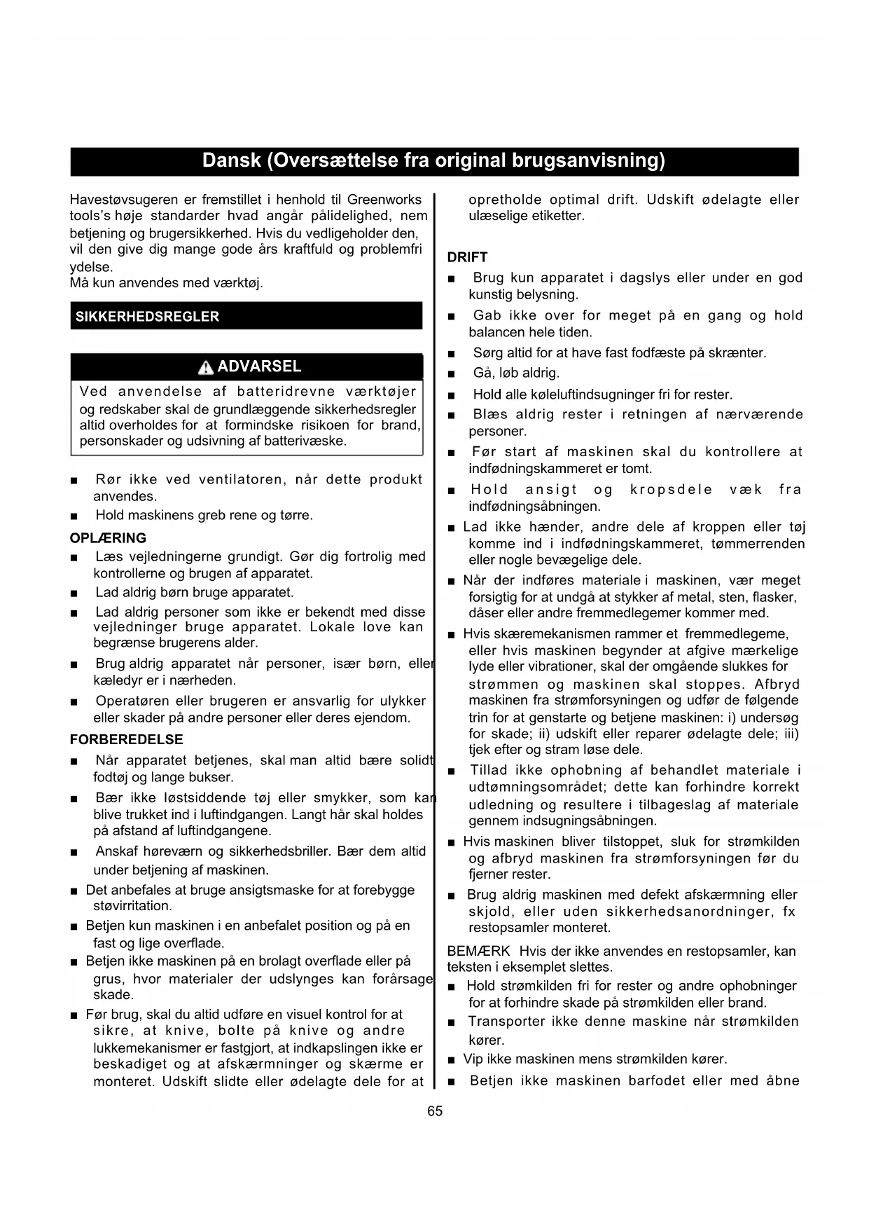 Dansk (Oversættelse fra original brugsanvisning) Havestøvsugeren er fremstillet i henhold til Greenworks tools’s høje standarder hvad angår pålidelighed, nem betjening og brugersikkerhed. Hvis du vedligeholder den, vil den give dig mange gode års kraftfuld og problemfri ydelse. Må kun anvendes med værktøj. SIkkERHEDSREGlER ADVARSEl Ved anvendelse af batteridrevne værktøjer og redskaber skal de grundlæggende sikkerhedsregler altid overholdes for at formindske risikoen for brand, personskader og udsivning af batterivæske. ■ Rør ikke ved ventilatoren, når dette produkt anvendes. ■ Hold maskinens greb rene og tørre. OPlæRING ■ Læs vejledningerne grundigt. Gør dig fortrolig med kontrollerne og brugen af apparatet. ■ Lad aldrig børn bruge apparatet. ■ Lad aldrig personer som ikke er bekendt med disse vejledninger bruge apparatet. Lokale love kan begrænse brugerens alder. ■ Brug aldrig apparatet når personer, især børn, eller kæledyr er i nærheden. ■ Operatøren eller brugeren er ansvarlig for ulykker eller skader på andre personer eller deres ejendom. FORBEREDElSE ■ Når apparatet betjenes, skal man altid bære solidt fodtøj og lange bukser. ■ Bær ikke løstsiddende tøj eller smykker, som kan blive trukket ind i luftindgangen. Langt hår skal holdes på afstand af luftindgangene. ■ Anskaf høreværn og sikkerhedsbriller. Bær dem altid under betjening af maskinen. ■ Det anbefales at bruge ansigtsmaske for at forebygge støvirritation. ■ Betjen kun maskinen i en anbefalet position og på en fast og lige overflade. ■ Betjen ikke maskinen på en brolagt overflade eller på grus, hvor materialer der udslynges kan forårsage skade. ■ Før brug, skal du altid udføre en visuel kontrol for at sikre, at knive, bolte på knive og andre lukkemekanismer er fastgjort, at indkapslingen ikke er beskadiget og at afskærmninger og skærme er monteret. Udskift slidte eller ødelagte dele for at opretholde optimal drift. Udskift ødelagte eller ulæselige etiketter. DRIFT ■ Brug kun apparatet i dagslys eller under en god kunstig belysning. ■ Gab ikke over for meget på en gang og hold balancen hele tiden. ■ Sørg altid for at have fast fodfæste på skrænter. ■ Gå, løb aldrig. ■ Hold alle køleluftindsugninger fri for rester. ■ Blæs aldrig rester i retningen af nærværende personer. ■ Før start af maskinen skal du kontrollere at indfødningskammeret er tomt. ■ Hold ansigt og kropsdele væk fra indfødningsåbningen. ■ Lad ikke hænder, andre dele af kroppen eller tøj komme ind i indfødningskammeret, tømmerrenden eller nogle bevægelige dele. ■ Når der indføres materiale i maskinen, vær meget forsigtig for at undgå at stykker af metal, sten, flasker, dåser eller andre fremmedlegemer kommer med. ■ Hvis skæremekanismen rammer et fremmedlegeme, eller hvis maskinen begynder at afgive mærkelige lyde eller vibrationer, skal der omgående slukkes for strømmen og maskinen skal stoppes. Afbryd maskinen fra strømforsyningen og udfør de følgende trin for at genstarte og betjene maskinen: i) undersøg for skade; ii) udskift eller reparer ødelagte dele; iii) tjek efter og stram løse dele. ■ Tillad ikke ophobning af behandlet materiale i udtømningsområdet; dette kan forhindre korrekt udledning og resultere i tilbageslag af materiale gennem indsugningsåbningen. ■ Hvis maskinen bliver tilstoppet, sluk for strømkilden og afbryd maskinen fra strømforsyningen før du fjerner rester. ■ Brug aldrig maskinen med defekt afskærmning eller skjold, eller uden sikkerhedsanordninger, fx restopsamler monteret. BEMÆRK Hvis der ikke anvendes en restopsamler, kan teksten i eksemplet slettes. ■ Hold strømkilden fri for rester og andre ophobninger for at forhindre skade på strømkilden eller brand. ■ Transporter ikke denne maskine når strømkilden kører. ■ Vip ikke maskinen mens strømkilden kører. ■ Betjen ikke maskinen barfodet eller med åbne66 Dansk (Oversættelse fra original brugsanvisning) sandaler. Undgå at bære løstsiddende tøj eller tøj med hængende snore eller slips. ■ Hold altid afstand til udtømningsområdet når denne maskine betjenes. ■ Stop maskinen og afmonter batteripakken. Kontroller, at alle bevægelige dele er stoppet helt - når du forlader maskinen, - før rengøring af blokeringer, tilstopning af tømmerrende - før kontrol, rengøring eller arbejde på maskinen. VEDlIGEHOlDElSE OG OPBEVARING ■ Hold alle møtrikker, bolte og skruer spændte, for at sikre at maskinen har sikre arbejdsforhold. ■ Udskift slidte eller beskadige dele. ■ Brug kun originale reservedele og tilbehør. ■ Produktet skal altid opbevares på et tørt sted. ■ Når maskinen stoppes for service, kontrol eller opbevaring, eller for at skifte tilbehør, skal der slukkes for strømkilden, afbryd maskinen fra strømforsyningen og kontroller at alle bevægelige dele er stoppet helt. Lad maskinen køle helt af før du udfører kontroller, justeringer, osv. Vedligehold maskinen omhyggeligt og hold den ren. ■ Lad altid maskinen køle af før opbevaring. ■ Under vedligeholdelse af knive skal du være opmærksom på, at selvom strømmen er slukket på grund af blokeringsanordningen på afskærmningen, kan knivene stadig bevæges. ■ Forsøg aldrig at tilsidesætte afskærmningens blokeringsanordning. ADVARSEl Ved udskiftning skal der altid anvendes originale reservedele. Hvis denne regel ikke overholdes, kan maskinens drift blive forringet, og man kan komme til skade. Desuden bortfalder garantien. Betegnelsen "elektrisk værktøj" i de efterfølgende sikkerhedsanvisninger gælder både for elektriske værktøjer og redskaber, som tilsluttes lysnettet, og batteridrevne værktøjer eller redskaber. ARBEJDSOMGIVElSER ■ Sørg for at holde arbejdsstedet rent og ryddeligt og for at have godt lys til arbejdet. Rodede og mørke arbejdssteder er kilde til uheld og ulykker. ■ Brug ikke elektriske redskaber eller vær