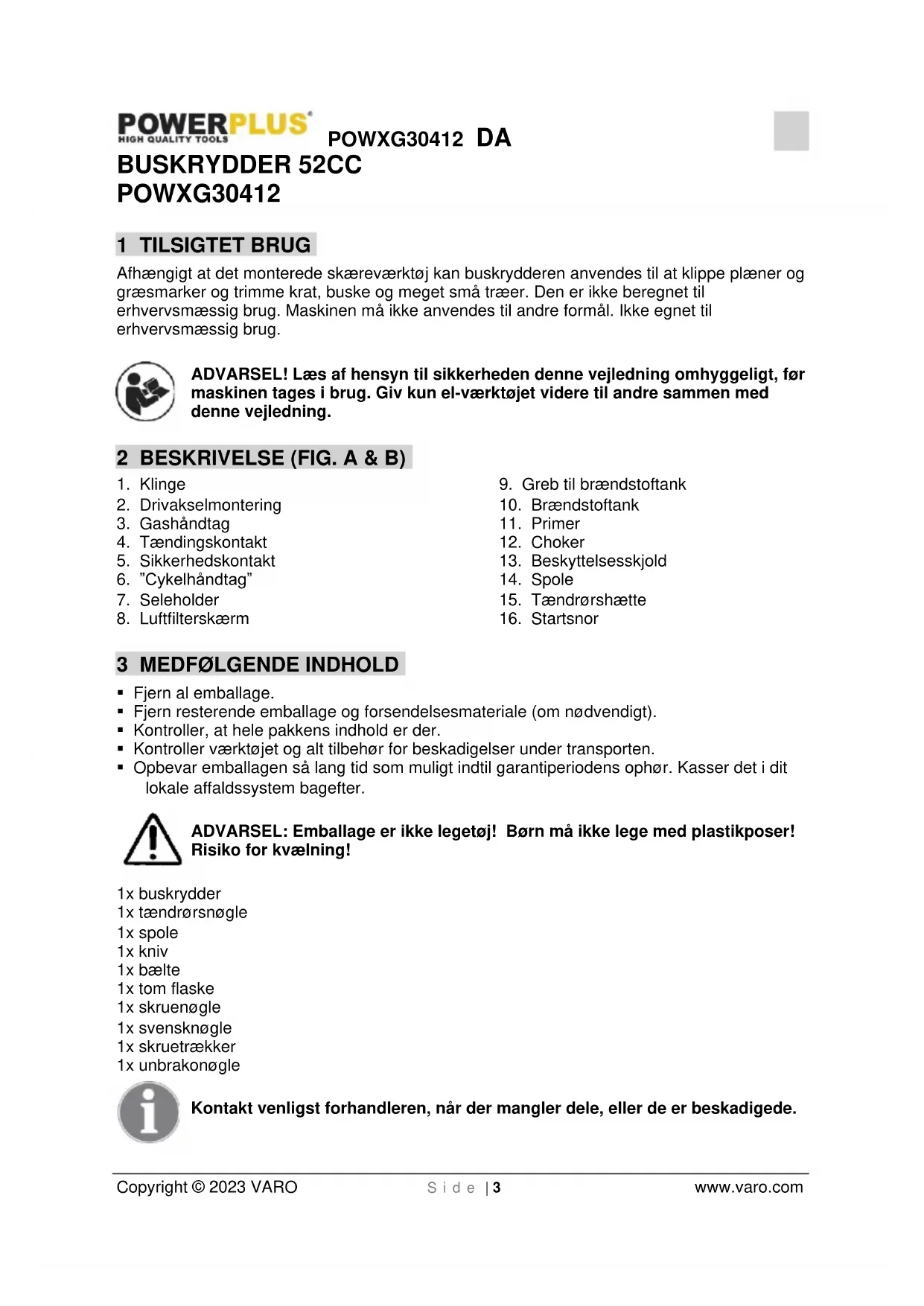 Copyright © 2023 VARO S i d e | 3 www.varo.com BUSKRYDDER 52CC POWXG30412 1 TILSIGTET BRUG Afhængigt at det monterede skæreværktøj kan buskrydderen anvendes til at klippe plæner og græsmarker og trimme krat, buske og meget små træer. Den er ikke beregnet til erhvervsmæssig brug. Maskinen må ikke anvendes til andre formål. Ikke egnet til erhvervsmæssig brug. ADVARSEL! Læs af hensyn til sikkerheden denne vejledning omhyggeligt, før maskinen tages i brug. Giv kun el-værktøjet videre til andre sammen med denne vejledning. 2 BESKRIVELSE (FIG. A & B)