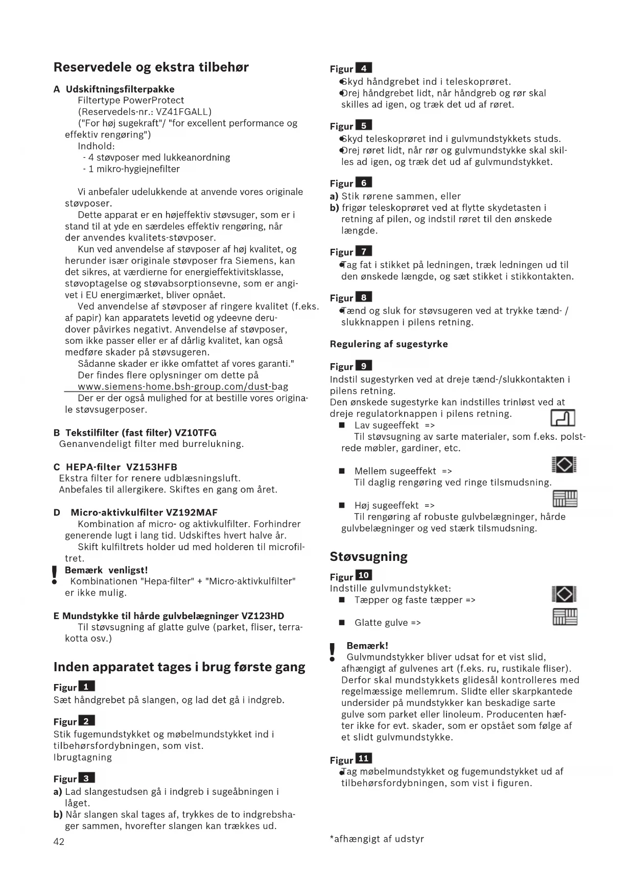 Geen schuurmiddel, glas of allesreiniger gebruiken. De stofzuiger nooit in water houden. Het stofreservoir kan indien nodig met een tweede stofzuiger worden uitgezogen, of eenvoudig met een droge stofdoek of stofkwast worden schoongemaakt. Technische wijzigingen voorbehouden.42 Reservedele og ekstra tilbehør A Udskiftningsfilterpakke Filtertype PowerProtect (Reservedels-nr.: VZ41FGALL) ("For høj sugekraft"/ "for excellent performance og effektiv rengøring") Indhold: - 4 støvposer med lukkeanordning - 1 mikro-hygiejnefilter Vi anbefaler udelukkende at anvende vores originale støvposer. Dette apparat er en højeffektiv støvsuger, som er i stand til at yde en særdeles effektiv rengøring, når der anvendes kvalitets-støvposer. Kun ved anvendelse af støvposer af høj kvalitet, og herunder især originale støvposer fra Siemens, kan det sikres, at værdierne for energieffektivitsklasse, støvoptagelse og støvabsorptionsevne, som er angi- vet i EU energimærket, bliver opnået. Ved anvendelse af støvposer af ringere kvalitet (f.eks. af papir) kan apparatets levetid og ydeevne deru- dover påvirkes negativt. Anvendelse af støvposer, som ikke passer eller er af dårlig kvalitet, kan også medføre skader på støvsugeren. Sådanne skader er ikke omfattet af vores garanti." Der findes flere oplysninger om dette på www.siemens-home.bsh-group.com/dust-bag Der er der også mulighed for at bestille vores origina- le støvsugerposer. B Tekstilfilter (fast filter) VZ10TFG Genanvendeligt filter med burrelukning. C HEPA-filter VZ153HFB Ekstra filter for renere udblæsningsluft. Anbefales til allergikere. Skiftes en gang om året. D Micro-aktivkulfilter VZ192MAF Kombination af micro- og aktivkulfilter. Forhindrer generende lugt i lang tid. Udskiftes hvert halve år. Skift kulfiltrets holder ud med holderen til microfil- tret.