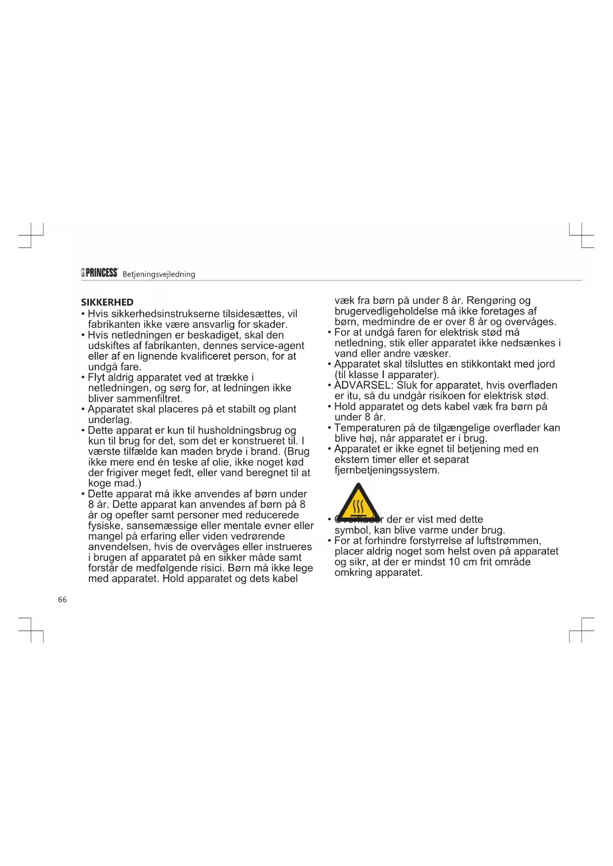 - Dette apparat må ikke anvendes af børn under 8 år. Dette apparat kan anvendes af børn på 8 år og opefter samt personer med reducerede fysiske, sansemæssige eller mentale evner eller mangel på erfaring eller viden vedrørende anvendelsen, hvis de overvåges eller instrueres i brugen af apparatet på en sikker måde samt forstår de medfølgende risici. Børn må ikke lege med apparatet. Hold apparatet og dets kabel væk fra børn på under 8 år. Rengøring og brugervedligeholdelse må ikke foretages af børn, medmindre de er over 8 år og overvåges.