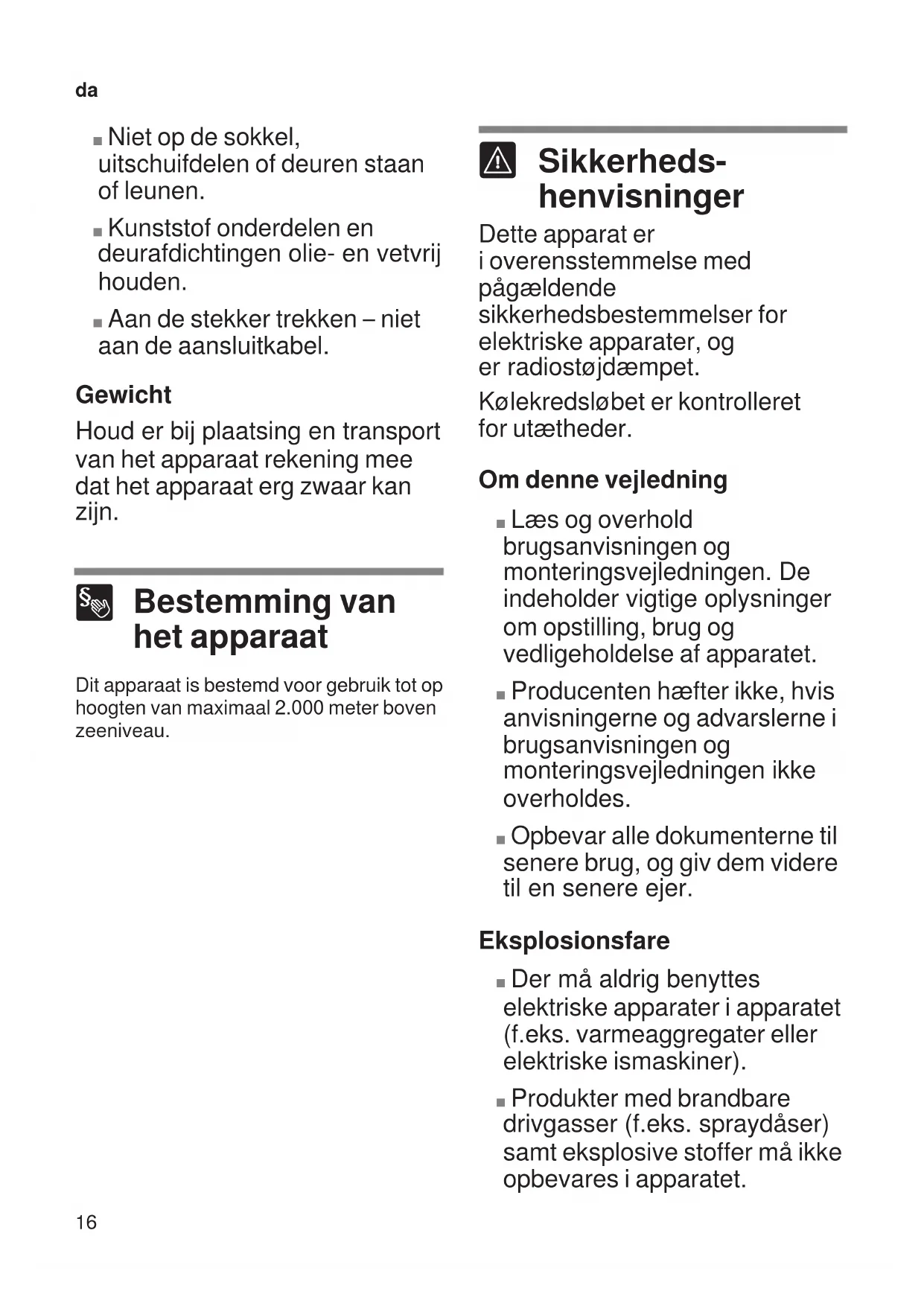 Dette apparat er i overensstemmelse med pågældende sikkerhedsbestemmelser for elektriske apparater, og er radiostøjdæmpet. Kølekredsløbet er kontrolleret for utætheder. Om denne vejledning ■ Læs og overhold brugsanvisningen og monteringsvejledningen. De indeholder vigtige oplysninger om opstilling, brug og vedligeholdelse af apparatet. ■ Producenten hæfter ikke, hvis anvisningerne og advarslerne i brugsanvisningen og monteringsvejledningen ikke overholdes. ■ Opbevar alle dokumenterne til senere brug, og giv dem videre til en senere ejer. Eksplosionsfare ■ Der må aldrig benyttes elektriske apparater i apparatet (f.eks. varmeaggregater eller elektriske ismaskiner). ■ Produkter med brandbare drivgasser (f.eks. spraydåser) samt eksplosive stoffer må ikke opbevares i apparatet.17