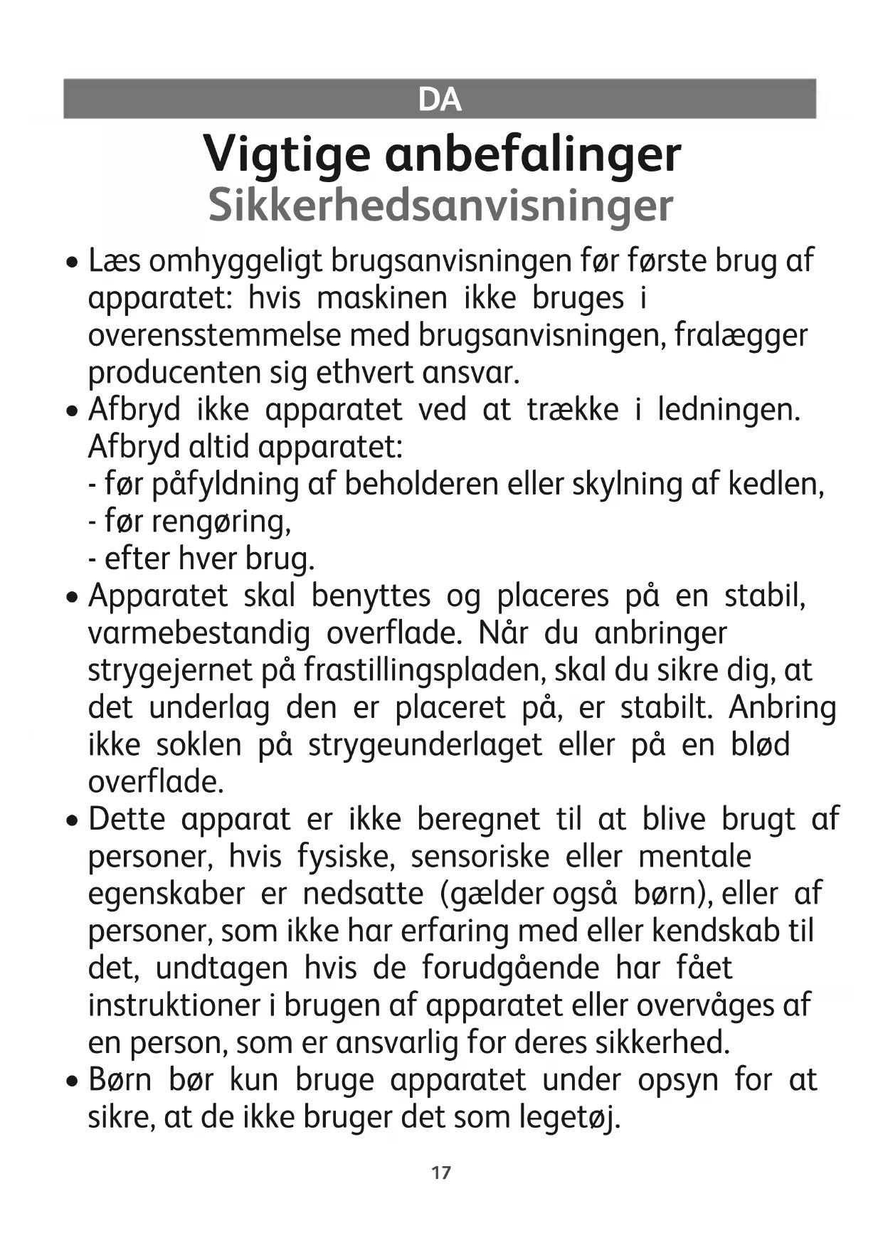 - Dette apparat er ikke beregnet til at blive brugt af personer, hvis fysiske, sensoriske eller mentale egenskaber er nedsatte (gælder også børn), eller af personer, som ikke har erfaring med eller kendskab til det, undtagen hvis de forudgående har fået instruktioner i brugen af apparatet eller overvåges af en person, som er ansvarlig for deres sikkerhed.