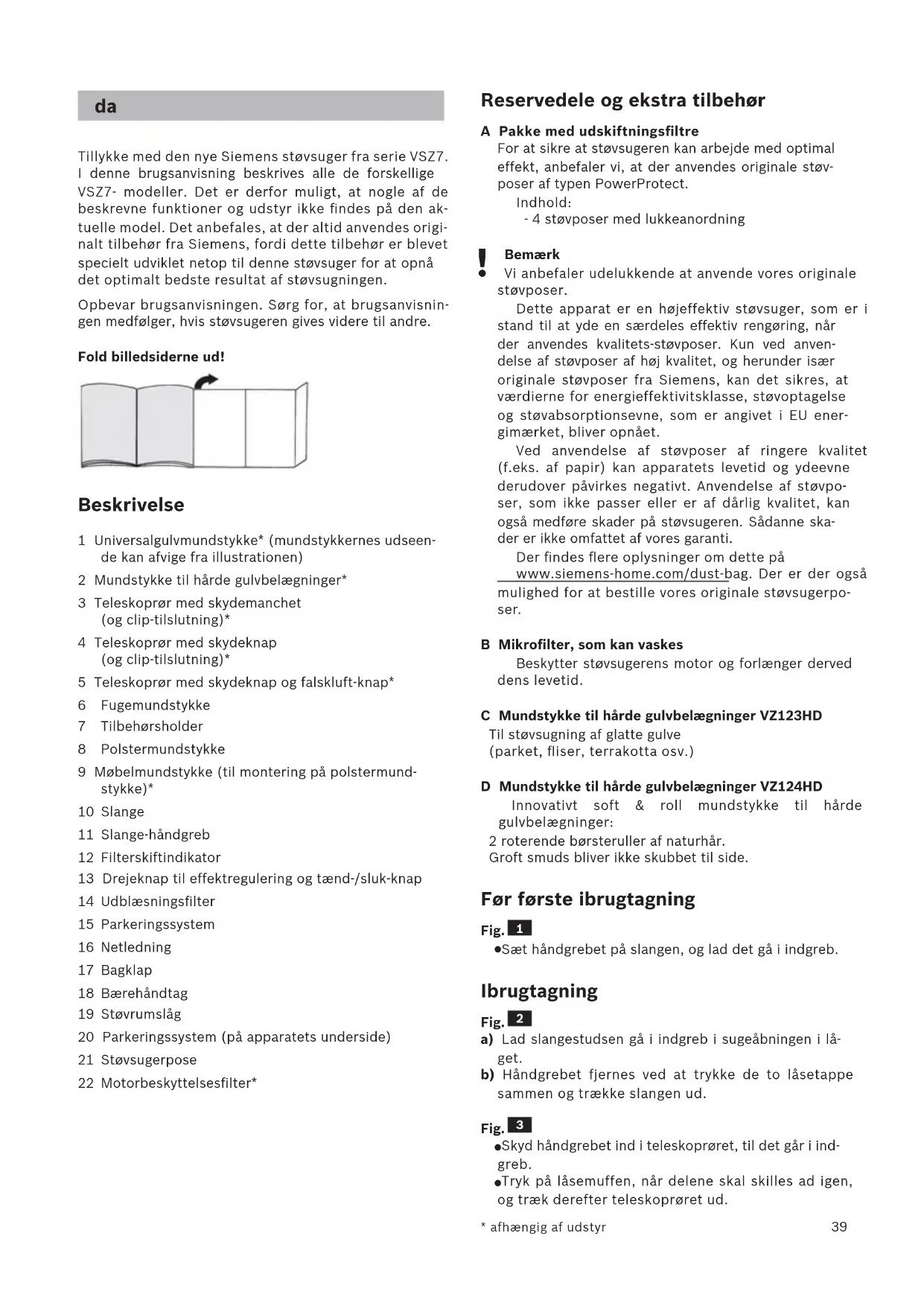 Geen schuurmiddelen, glas- of allesreiniger gebrui- ken. De stofzuiger nooit in water dompelen. Het stofcompartiment kan indien nodig met een tweede stofzuiger worden uitgezogen, of eenvoudig met een droge stofdoek of stofkwast worden schoon- gemaakt. Technische wijzigingen voorbehouden.39 Tillykke med den nye Siemens støvsuger fra serie VSZ7. I denne brugsanvisning beskrives alle de forskellige VSZ7- modeller. Det er derfor muligt, at nogle af de beskrevne funktioner og udstyr ikke findes på den ak- tuelle model. Det anbefales, at der altid anvendes origi- nalt tilbehør fra Siemens, fordi dette tilbehør er blevet specielt udviklet netop til denne støvsuger for at opnå det optimalt bedste resultat af støvsugningen. Opbevar brugsanvisningen. Sørg for, at brugsanvisnin- gen medfølger, hvis støvsugeren gives videre til andre. Fold billedsiderne ud! Beskrivelse 1 Universalgulvmundstykke* (mundstykkernes udseen- de kan afvige fra illustrationen) 2 Mundstykke til hårde gulvbelægninger* 3 Teleskoprør med skydemanchet (og clip-tilslutning)* 4 Teleskoprør med skydeknap (og clip-tilslutning)* 5 Teleskoprør med skydeknap og falskluft-knap* 6 Fugemundstykke 7 Tilbehørsholder 8 Polstermundstykke 9 Møbelmundstykke (til montering på polstermund- stykke)* 10 Slange 11 Slange-håndgreb 12 Filterskiftindikator 13 Drejeknap til effektregulering og tænd-/sluk-knap 14 Udblæsningsfilter 15 Parkeringssystem 16 Netledning 17 Bagklap 18 Bærehåndtag 19 Støvrumslåg 20 Parkeringssystem (på apparatets underside) 21 Støvsugerpose 22 Motorbeskyttelsesfilter*