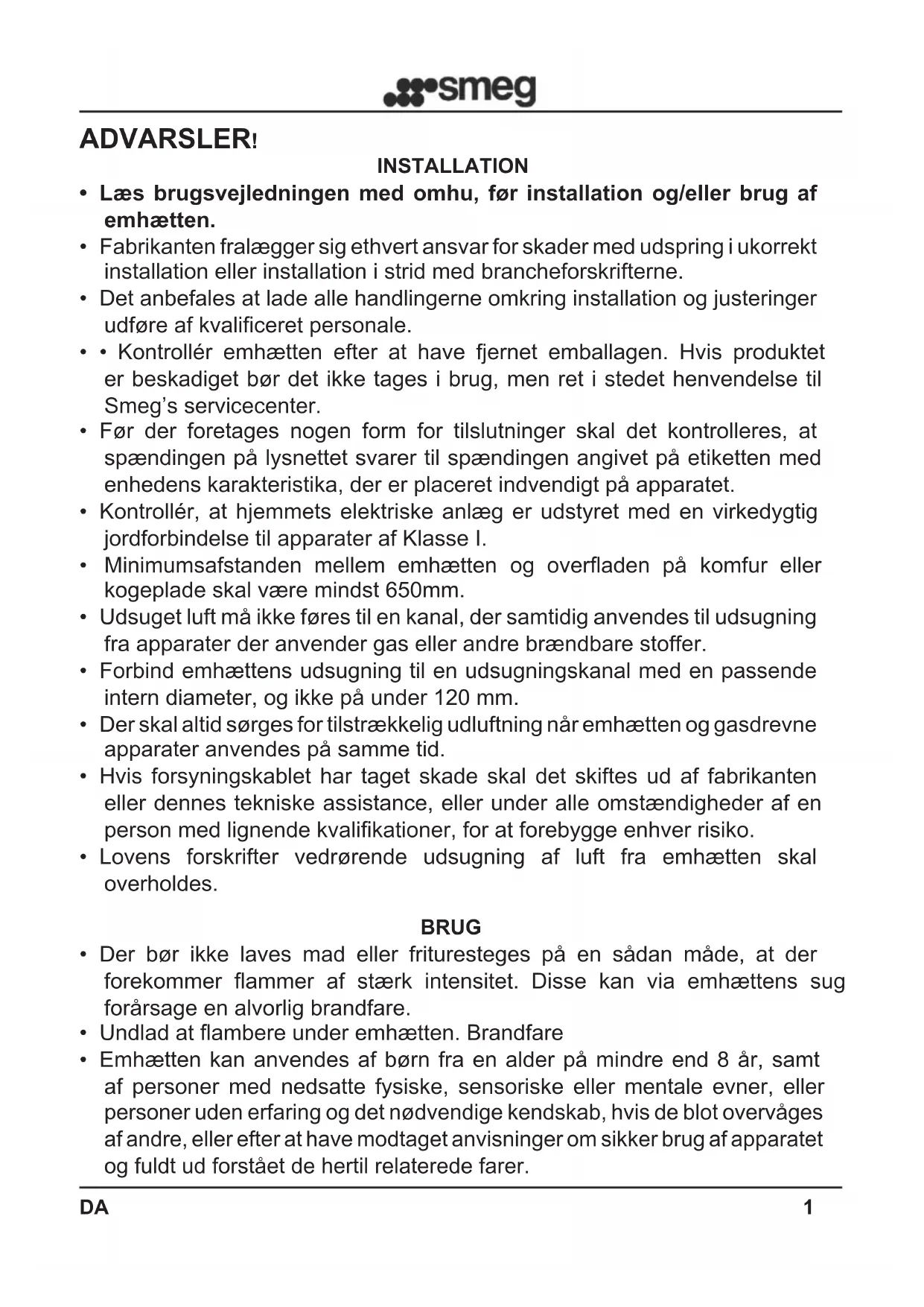 - Læs brugsvejledningen med omhu, før installation og/eller brug af emhætten.