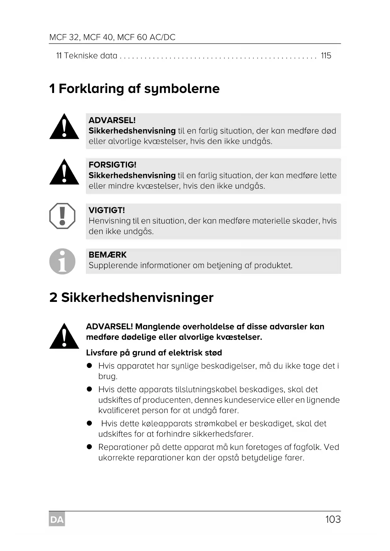 ADVARSEL! Manglende overholdelse af disse advarsler kan medføre dødelige eller alvorlige kvæstelser. Livsfare på grund af elektrisk stød Hvis apparatet har synlige beskadigelser, må du ikke tage det i brug. Hvis dette apparats tilslutningskabel beskadiges, skal det udskiftes af producenten, dennes kundeservice eller en lignende kvalificeret person for at undgå farer. Hvis dette køleapparats strømkabel er beskadiget, skal det udskiftes for at forhindre sikkerhedsfarer. Reparationer på dette apparat må kun foretages af fagfolk. Ved ukorrekte reparationer kan der opstå betydelige farer. ADVARSEL! Sikkerhedshenvisning til en farlig situation, der kan medføre død eller alvorlige kvæstelser, hvis den ikke undgås. FORSIGTIG! Sikkerhedshenvisning til en farlig situation, der kan medføre lette eller mindre kvæstelser, hvis den ikke undgås. VIGTIGT! Henvisning til en situation, der kan medføre materielle skader, hvis den ikke undgås. BEMÆRK Supplerende informationer om betjening af produktet. FR34-FR40-FR60_MCF32-MCF40-MCF60_OPM_EMEA16.book Seite 103 Donnerstag, 13. Februar 2020 3:51 15DA Sikkerhedshenvisninger MCF 32, MCF 40, MCF 60 AC/DC