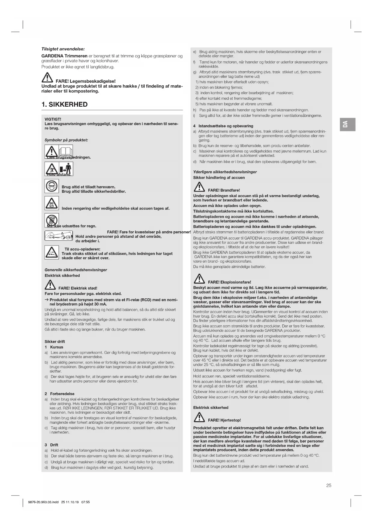 4 Istandsættelse og opbevaring a) Afbryd maskinens strømforsyning (dvs. træk stikket ud, fjern spærreanordnin- gen eller tag batterierne ud) inden der gennemføres vedligeholdelse eller ren- gøring. b) Brug kun de reserve- og tilbehørsdele, som produ centen anbefaler. c) Maskinen skal kontrolleres og vedligeholdes med jævne mellemrum. Lad kun maskinen reparere på et autoriseret værksted. d) Når maskinen ikke er i brug, skal den opbevares utilgængeligt for børn. Yderligere sikkerhedshenvisninger Sikker håndtering af accuen FARE! Brandfare! Under opladningen skal accuen stå på et varme bestandigt underlag, som hverken er brændbart eller ledende. Accuen må ikke oplades uden opsyn. Tilslutningskontakterne må ikke kortsluttes. Batteriopladeren og accuen må ikke komme i nærheden af ætsende, brændbare og letantændelige genstande. Batteriopladeren og accuen må ikke dækkes til under opladningen. Afbryd straks strømmen til batteriopladeren i tilfælde af røgdannelse eller brand. Brug kun GARDENA accuer til GARDENA accu-produktet. GARDENA påtager sig ikke ansvaret for accuer fra andre producenter. Disse kan udløse en brand- og eksplosionsfare, i tilfælde af at de har en lavere kvalitet! Brug ikke GARDENA batteriopladeren til at oplade eksterne accuer, da GARDENA ikke kan garantere kompatibiliteten, og da der også her kan være en brand- og eksplosionsfare. Du må ikke genoplade almindelige batterier. FARE! Eksplosionsfare! Beskyt accuen mod varme og ild. Læg ikke accuerne på varmeapparater, og udsæt dem ikke for direkte sol i længere tid. Brug dem ikke i eksplosive miljøer f.eks. i nærheden af antændelige væsker, gasser eller støvansamlinger. Ved brug af accuer kan der ske gnistdannelse, hvilket kan antænde støv eller dampe. Kontroller accuen inden hver brug. UGennemfør en visuel kontrol af accuen inden hver brug. En defekt accu skal bortskaffes korrekt. Send det ikke med posten. Du finder yderligere informationer hos din affaldshåndteringsvirksomhed. Brug ikke accuen som strømkilde til andre produkter. Der er fare for kvæstelser. Brug udelukkende accuer til de beregnede GARDENA produkter. Accuen må kun oplades og anvendes ved omgivelsestemperaturer mellem 0 °C og 40 °C. Lad accuen afkøle efter længere tids brug. Kontroller ladekablet regelmæssigt for tegn på skader og aldring (porøsitet). Brug kun kablet, hvis det ikke er defekt. Opbevar og transportér under ingen omstændigheder accuen ved temperaturer over 45 °C eller i direkte sol. Det bedste er at opbevare accuen ved temperaturer under 25 °C, så selvafladningen er så lille som mulig. Udsæt ikke accuen for hverken regn, vand (neddypning) eller fugt. Hold accuen ren, specielt ventilationsslidserne. Hvis accuen ikke bliver brugt i længere tid (om vinteren), skal den oplades helt, for at undgå at den bliver fuldt afladet. Opbevar ikke accuen i et produkt for at undgå selvafladning, misbrug og uheld. Opbevar ikke accuen i rum, hvor der kan ske elektro statisk udladning. Elektrisk sikkerhed FARE! Hjertestop! Produktet opretter et elektromagnetisk felt under driften. Dette felt kan under bestemte betingelser have indflydelse på funktionen af aktive eller passive medicinske implantater. For at udelukke livsfarlige situationer, der kan medføre alvorlige kvæstelser med døden til følge, bør personer med et medicinsk implantat sætte sig i forbindelse med en læge eller implantatets producent, inden dette produkt anvendes. Brug kun det batteridrevne produkt ved temperaturer på mellem 0 og 40 °C. I nødstilfælde tages accuen ud. Undlad at bruge produktet til pleje af en dam eller i nærheden af vand. VIGTIGT! Læs brugsanvisningen omhyggeligt, og opbevar den i nærheden til sene- re brug. Symboler på produktet: Læs brugsvejledningen. Hold afstand. Brug altid et tilladt høreværn. Brug altid tilladte sikkerhedsbriller.