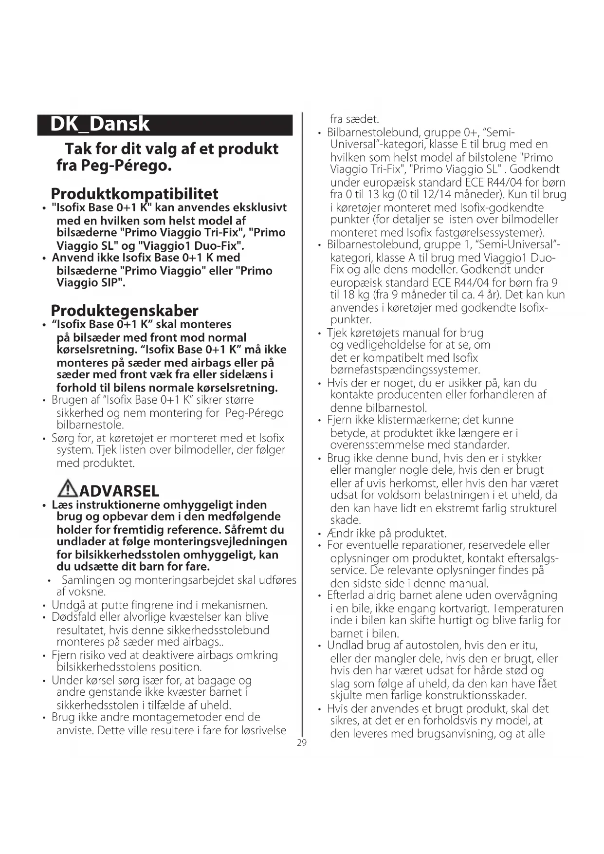 - Anvend ikke Isofix Base 0+1 K med bilsæderne "Primo Viaggio" eller "Primo Viaggio SIP". Produktegenskaber