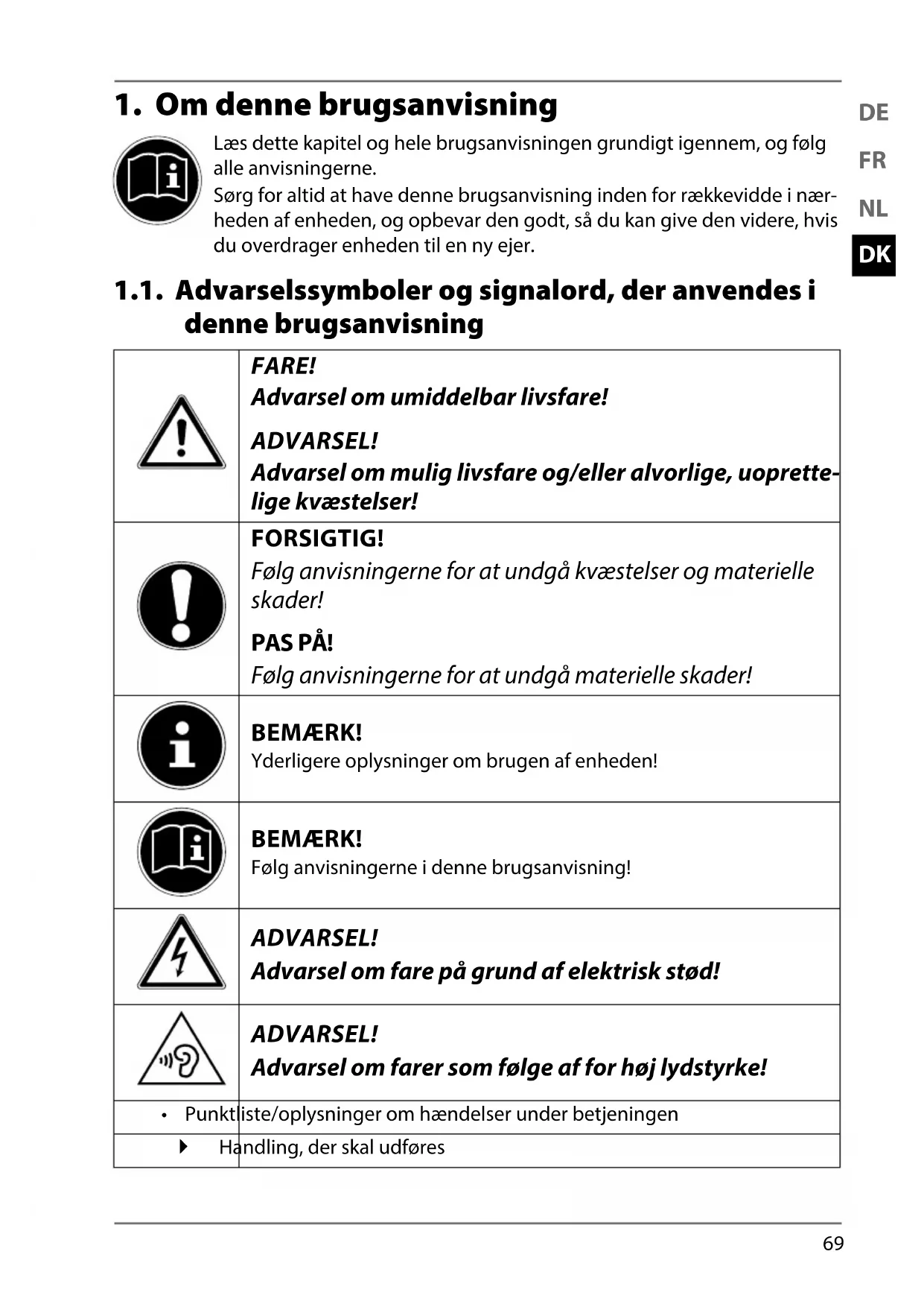Læs dette kapitel og hele brugsanvisningen grundigt igennem, og følg alle anvisningerne. Sørg for altid at have denne brugsanvisning inden for rækkevidde i nær- heden af enheden, og opbevar den godt, så du kan give den videre, hvis du overdrager enheden til en ny ejer. 1.1. Advarselssymboler og signalord, der anvendes i denne brugsanvisning FARE! Advarsel om umiddelbar livsfare! ADVARSEL! Advarsel om mulig livsfare og/eller alvorlige, uoprette- lige kvæstelser! FORSIGTIG! Følg anvisningerne for at undgå kvæstelser og materielle skader! PAS PÅ! Følg anvisningerne for at undgå materielle skader! BEMÆRK! Yderligere oplysninger om brugen af enheden! BEMÆRK! Følg anvisningerne i denne brugsanvisning! ADVARSEL! Advarsel om fare på grund af elektrisk stød! ADVARSEL! Advarsel om farer som følge af for høj lydstyrke!