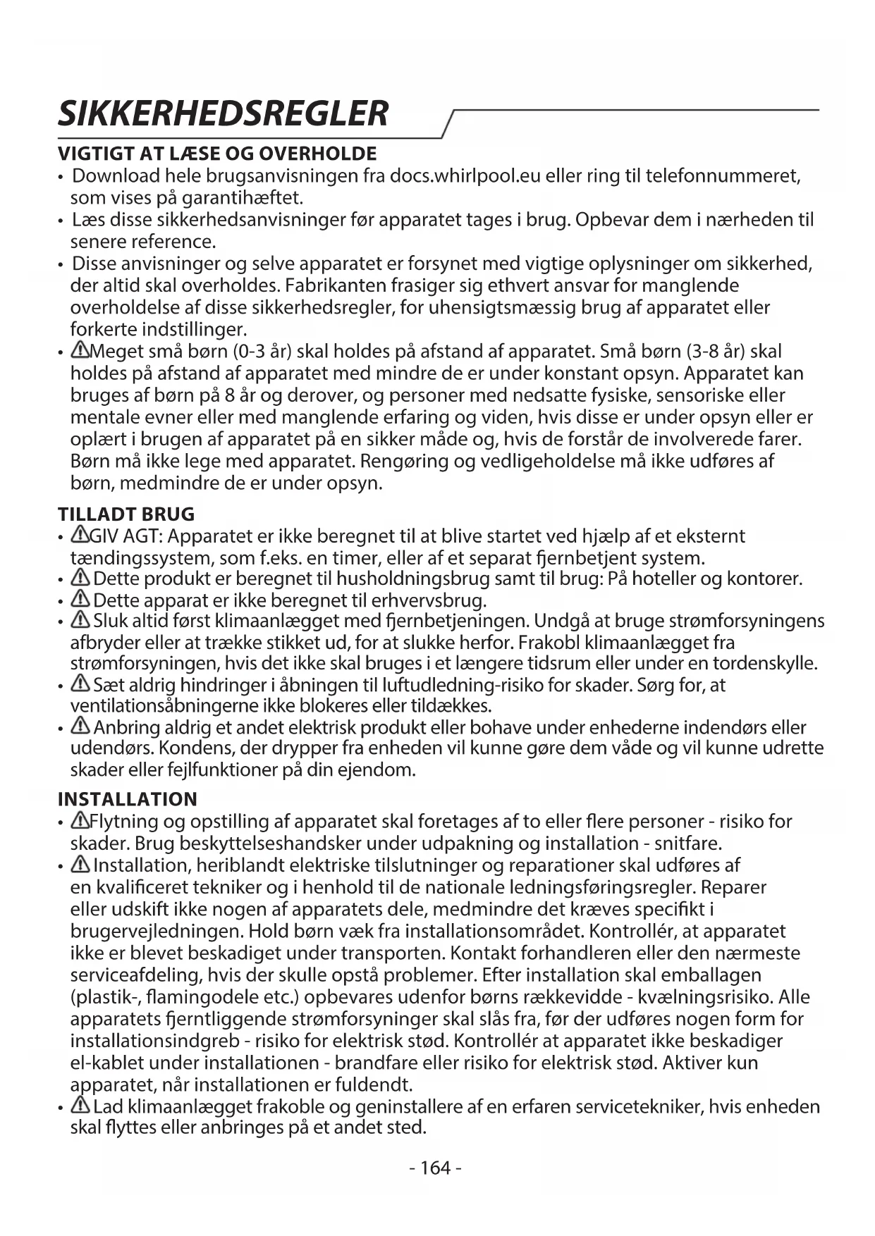Lad klimaanlægget frakoble og geninstallere af en erfaren servicetekniker, hvis enheden skal yttes eller anbringes på et andet sted. SIKKERHEDSREGLER- 165 -