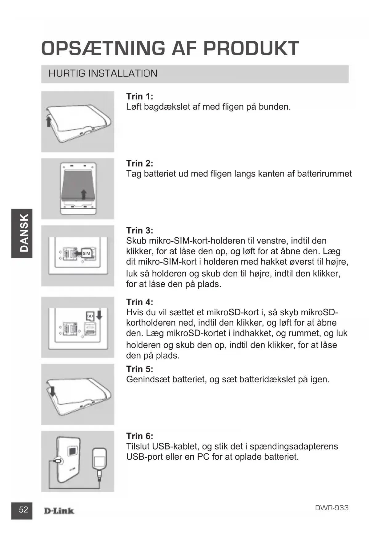 Hvis én eller ere dele mangler i pakken, bedes du kontakte forhandleren. Anvendelse af andet batteri end det medsendte kan forårsage skade eller ulykke. DOKuMENTATION52 DWR-933 DANSK OPSÆTNING AF PRODuKT HuRTiG iNSTALLATioN Trin 6: Tilslut USB-kablet, og stik det i spændingsadapterens USB-port eller en PC for at oplade batteriet. Trin 1: Løft bagdækslet af med igen på bunden. Trin 5: Genindsæt batteriet, og sæt batteridækslet på igen. Trin 3: Skub mikro-SIM-kort-holderen til venstre, indtil den klikker, for at låse den op, og løft for at åbne den. Læg dit mikro-SIM-kort i holderen med hakket øverst til højre, luk så holderen og skub den til højre, indtil den klikker, for at låse den på plads. Trin 2: Tag batteriet ud med igen langs kanten af batterirummet Trin 4: Hvis du vil sættet et mikroSD-kort i, så skyb mikroSD- kortholderen ned, indtil den klikker, og løft for at åbne den. Læg mikroSD-kortet i indhakket, og rummet, og luk holderen og skub den op, indtil den klikker, for at låse den på plads. SIM SD53 DWR-933 DANSK Trin 3: Brug en webbrowser til at gå til 192.168.0.1 for at logge ind til routerens kongurationsinterface. Standard- brugernavnet er admin, og kodeordet efterlades tomt. Trin 2: Tilslut din PC til en af DWR-933's trådløse netværk. Som standard er indstillingerne: