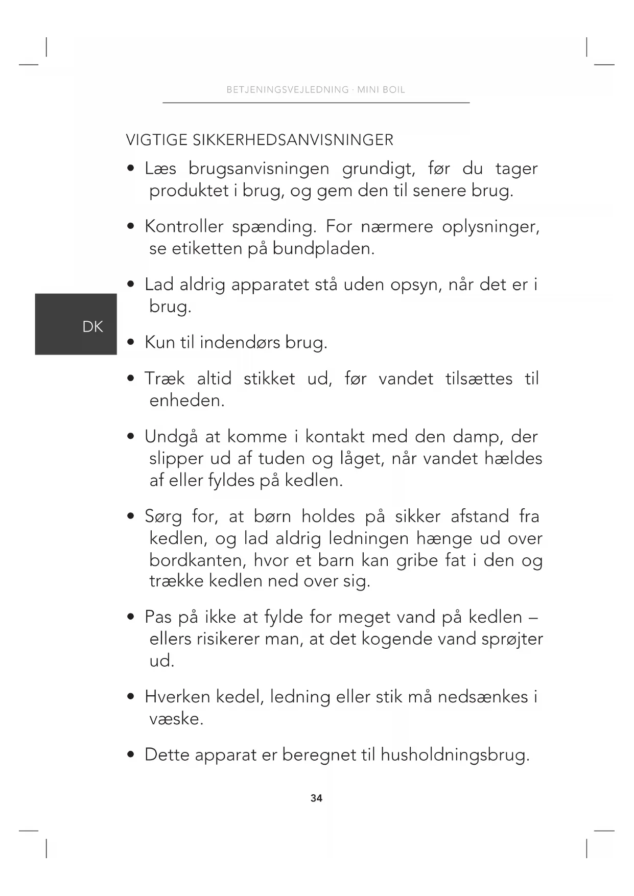 - Hverken kedel, ledning eller stik må nedsænkes i væske.