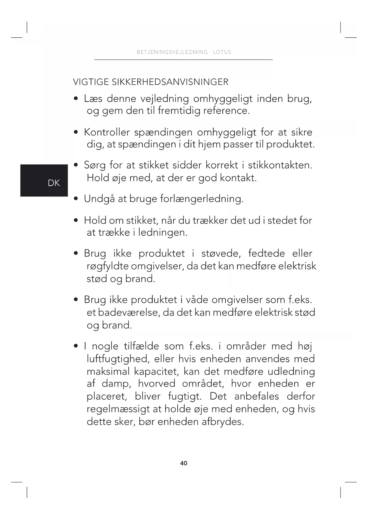 - Tag stikket ud af stikkontakten, når du fylder enheden med vand, rengør den, eller hvis enheden ikke skal bruges i længere tid.42 BETJENINGSVEJLEDNING · LOTUS