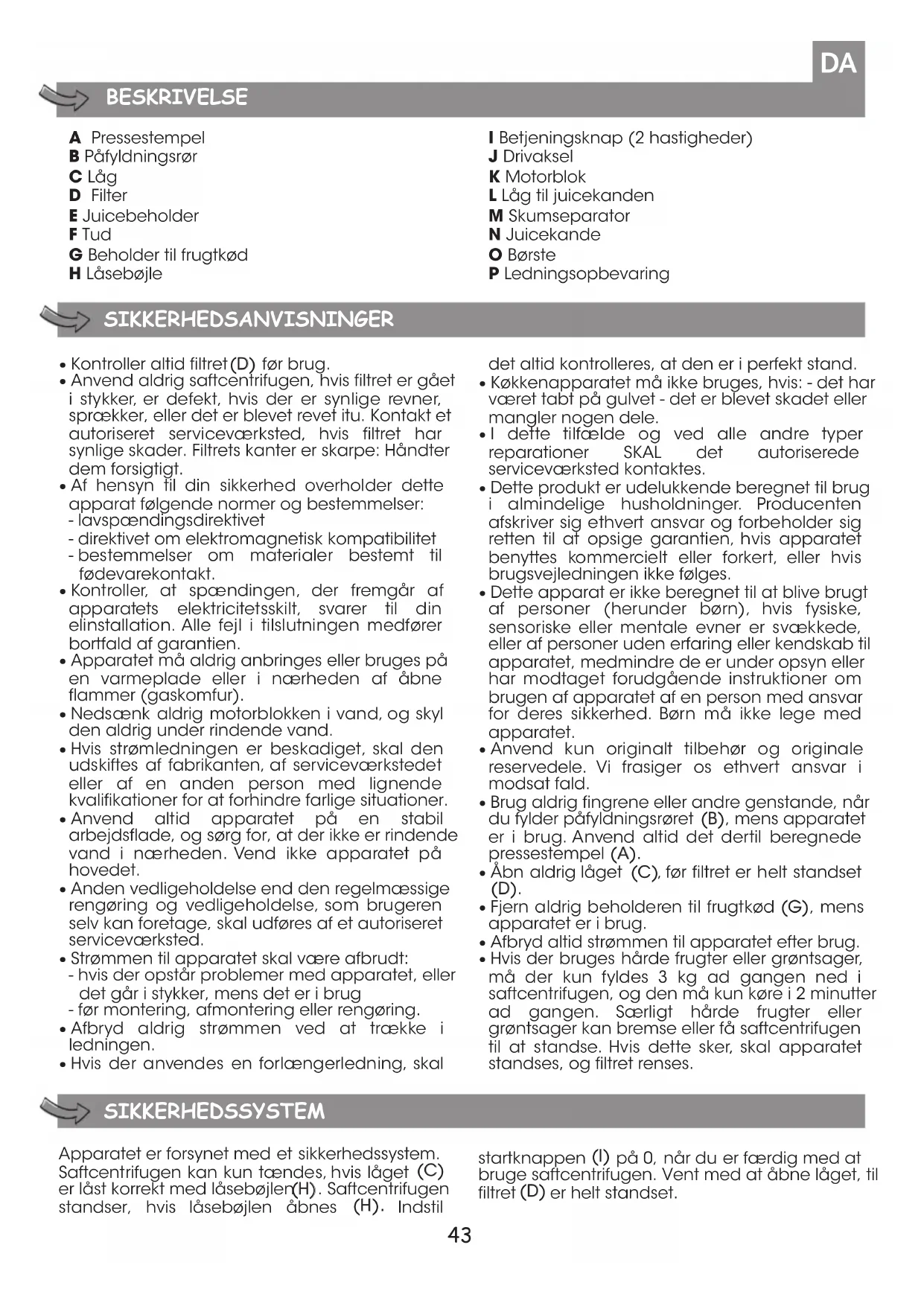 - Hvis der bruges hårde frugter eller grøntsager, må der kun fyldes 3 kg ad gangen ned i saftcentrifugen, og den må kun køre i 2 minutter ad gangen. Særligt hårde frugter eller grøntsager kan bremse eller få saftcentrifugen til at standse. Hvis dette sker, skal apparatet standses, og filtret renses. Apparatet er forsynet med et sikkerhedssystem. Saftcentrifugen kan kun tændes, hvis låget ((CC)) er låst korrekt med låsebøjlen ((HH)) . Saftcentrifugen standser, hvis låsebøjlen åbnes ((HH)).. Indstil startknappen ((II)) på 0, når du er færdig med at bruge saftcentrifugen. Vent med at åbne låget, til filtret ((DD)) er helt standset.44 FØRSTEGANGSBRUG BRUG HVILKEN HASTIGHED SKAL JEG VÆLGE?