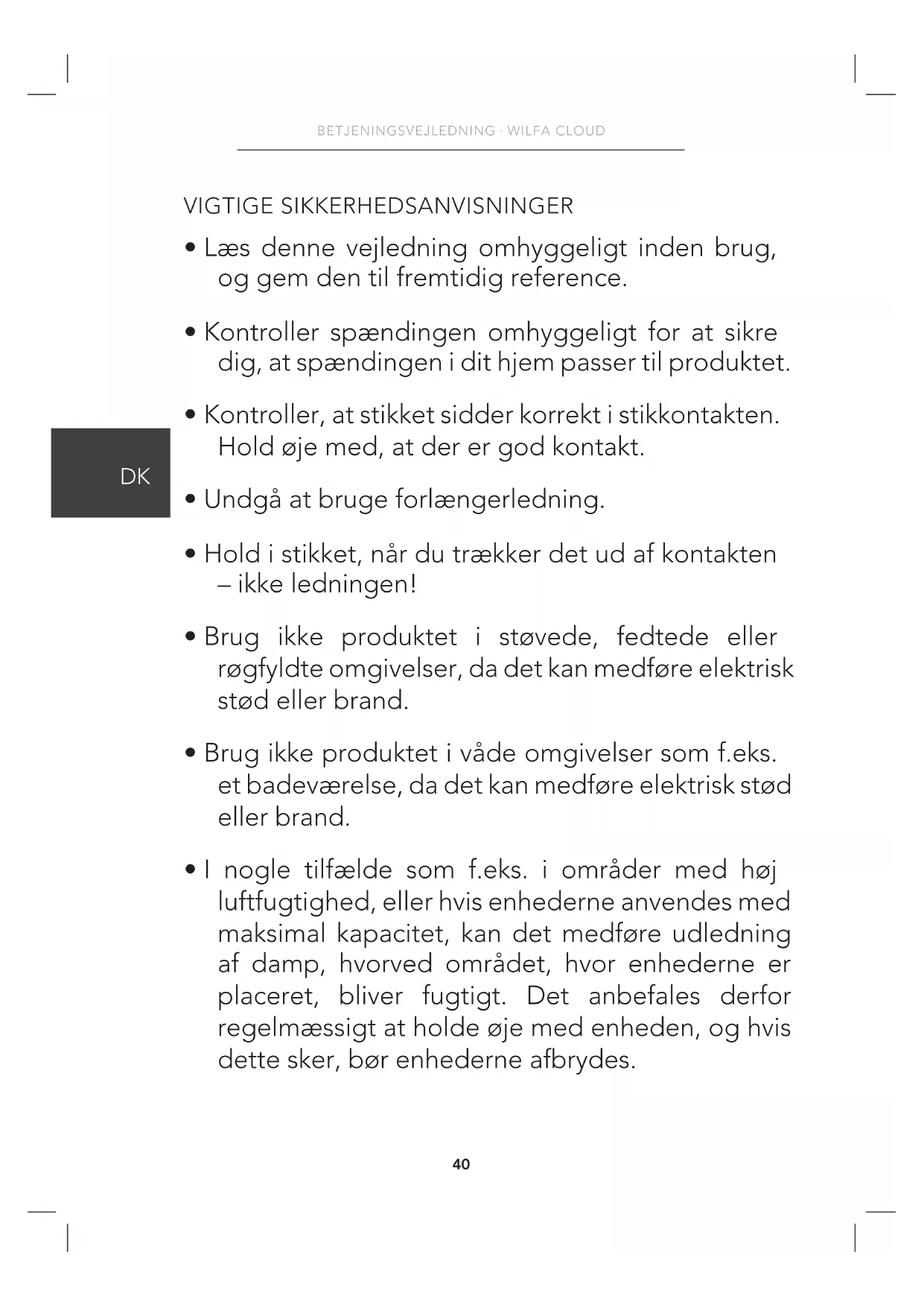- Undgå at bruge forlængerledning.
