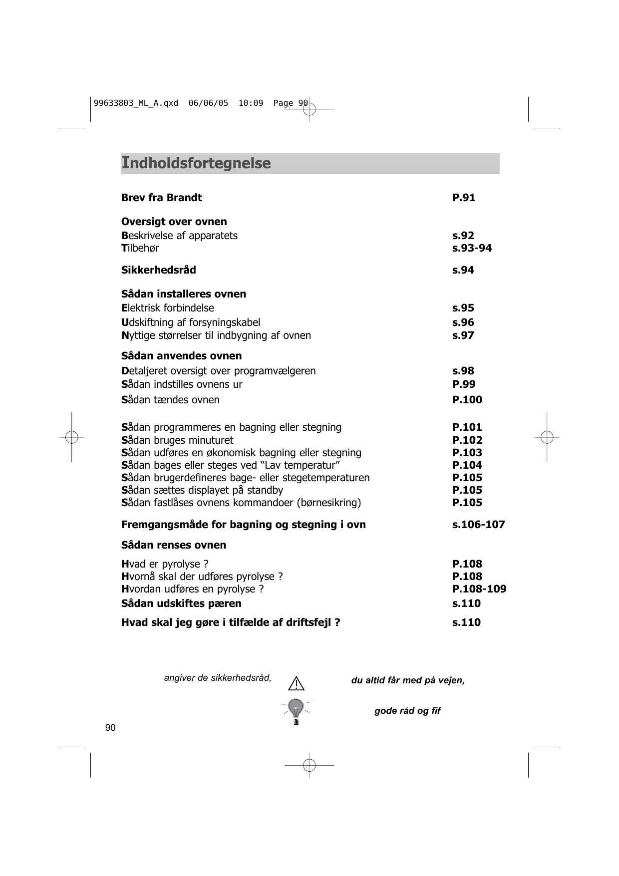 99633803_ML_A.qxd 06/06/05 10:09 Page 90 Indholdsfortegnelse Brev fra Brandt P.91 Oversigt over ovnen Beskrivelse af apparatets Tilbehør s.92 s.93-94 Sikkerhedsråd s.94 Sådan installeres ovnen Elektrisk forbindelse Udskiftning af forsyningskabel Nyttige størrelser til indbygning af ovnen s.95 s.96 s.97 Sådan anvendes ovnen Detaljeret oversigt over programvælgeren Sådan indstilles ovnens ur s.98 P.99 Sådan tændes ovnen P.100 Sådan Sådan Sådan Sådan Sådan Sådan Sådan P.101 P.102 P.103 P.104 P.105 P.105 P.105 programmeres en bagning eller stegning bruges minuturet udføres en økonomisk bagning eller stegning bages eller steges ved “Lav temperatur” brugerdefineres bage- eller stegetemperaturen sættes displayet på standby fastlåses ovnens kommandoer (børnesikring) Fremgangsmåde for bagning og stegning i ovn s.106-107 Sådan renses ovnen Hvad er pyrolyse ? Hvornå skal der udføres pyrolyse ? Hvordan udføres en pyrolyse ? Sådan udskiftes pæren P.108 P.108 P.108-109 s.110 Hvad skal jeg gøre i tilfælde af driftsfejl ? s.110 angiver de sikkerhedsråd, du altid får med på vejen, gode råd og fif