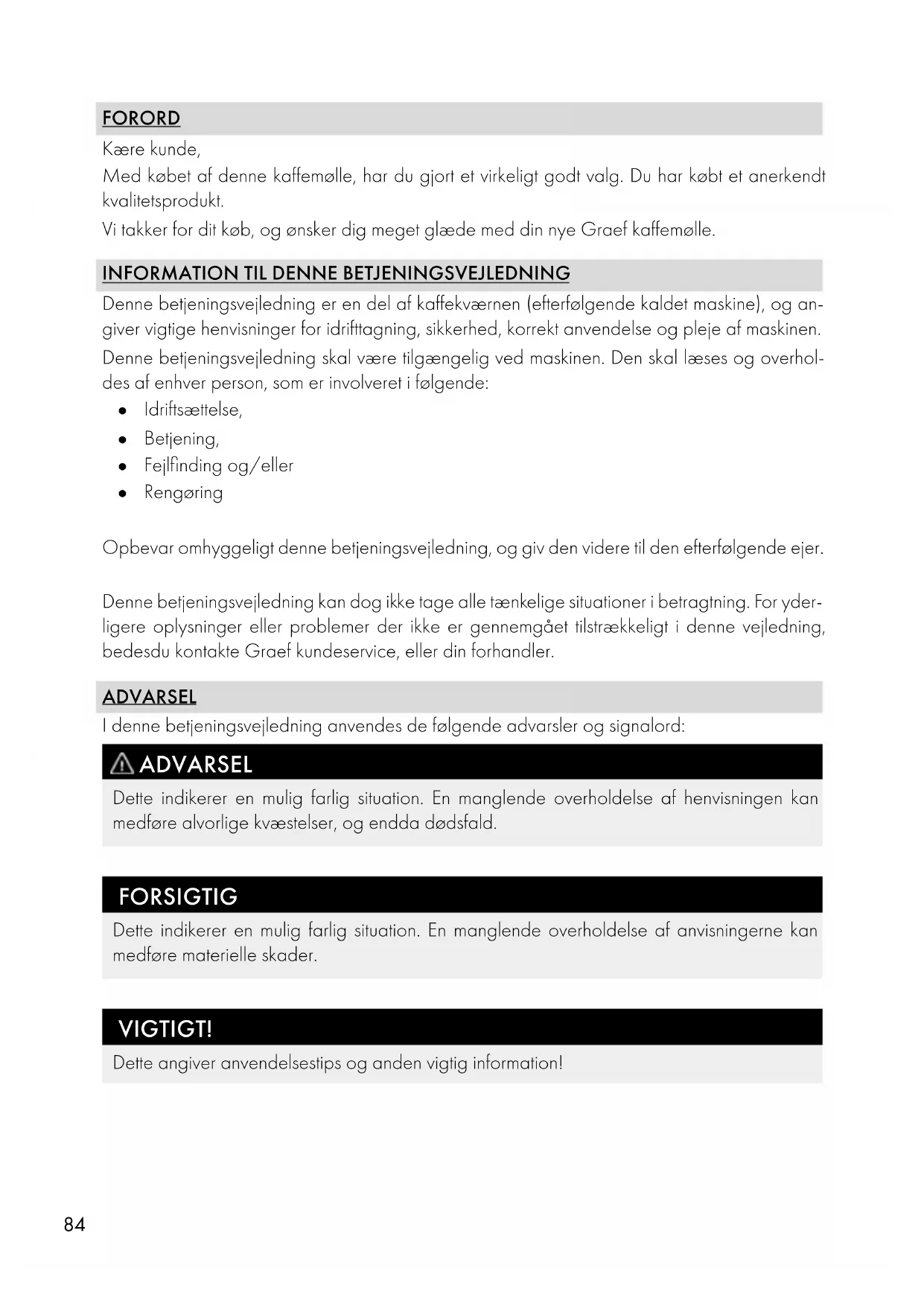 Denne betjeningsvejledning er en del af kaffekværnen (efterfølgende kaldet maskine), og an- giver vigtige henvisninger for idrifttagning, sikkerhed, korrekt anvendelse og pleje af maskinen. Denne betjeningsvejledning skal være tilgængelig ved maskinen. Den skal læses og overhol- des af enhver person, som er involveret i følgende: ● Idriftsættelse, ● Betjening, ● Fejlfinding og/eller ● Rengøring Opbevar omhyggeligt denne betjeningsvejledning, og giv den videre til den efterfølgende ejer. Denne betjeningsvejledning kan dog ikke tage alle tænkelige situationer i betragtning. For yder- ligere oplysninger eller problemer der ikke er gennemgået tilstrækkeligt i denne vejledning, bedesdu kontakte Graef kundeservice, eller din forhandler. ADVARSEL I denne betjeningsvejledning anvendes de følgende advarsler og signalord: ADVARSEL Dette indikerer en mulig farlig situation. En manglende overholdelse af henvisningen kan medføre alvorlige kvæstelser, og endda dødsfald. FORSIGTIG Dette indikerer en mulig farlig situation. En manglende overholdelse af anvisningerne kan medføre materielle skader. VIGTIGT! Dette angiver anvendelsestips og anden vigtig information!85
