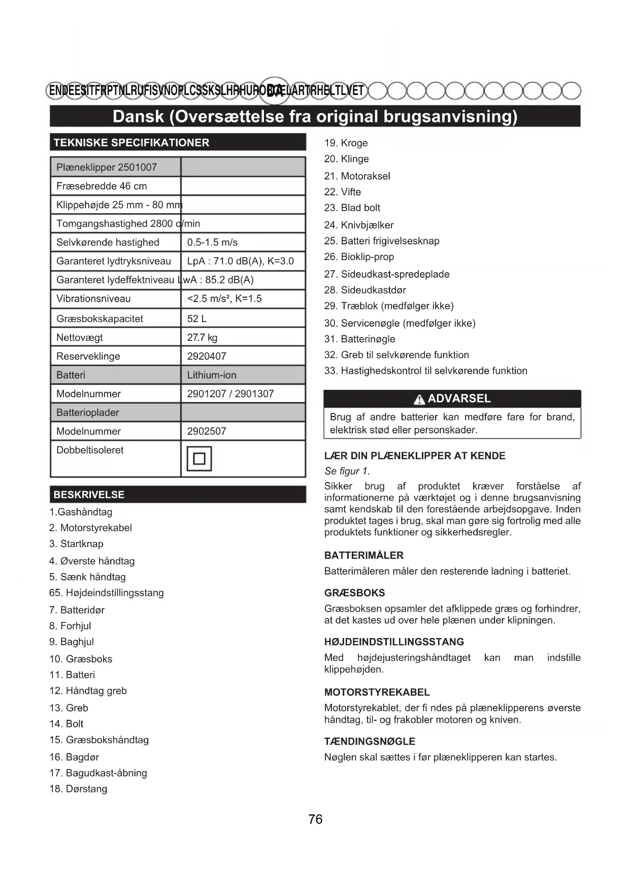 EN DE ES IT FR PT NL RU FI SV NO PL CS SK SL HR HU RO BG EL AR TR HE LT LV ET TEKNISKE SPECIFIKATIONERPlæneklipper 2501007Fræsebredde 46 cmKlippehøjde 25 mm - 80 mmTomgangshastighed 2800 o/minSelvkørende hastighed 0.5-1.5 m/sGaranteret lydtryksniveau LpA : 71.0 dB(A), K=3.0Garanteret lydeffektniveau LwA : 85.2 dB(A)Vibrationsniveau <2.5 m/s², K=1.5Græsbokskapacitet 52 L Nettovægt 27.7 kg Reserveklinge 2920407Batteri Lithium-ionModelnummer 2901207 / 2901307BatteriopladerModelnummer 2902507DobbeltisoleretBESKRIVELSE1.Gashåndtag2. Motorstyrekabel3. Startknap4. Øverste håndtag5. Sænk håndtag65. Højdeindstillingsstang7. Batteridør8. Forhjul9. Baghjul10. Græsboks11. Batteri12. Håndtag greb13. Greb14. Bolt15. Græsbokshåndtag16. Bagdør17. Bagudkast-åbning18. Dørstang19. Kroge20. Klinge21. Motoraksel22. Vifte23. Blad bolt24. Knivbjælker25. Batteri frigivelsesknap26. Bioklip-prop27. Sideudkast-spredeplade28. Sideudkastdør29. Træblok (medfølger ikke)30. Servicenøgle (medfølger ikke)31. Batterinøgle32. Greb til selvkørende funktion 33. Hastighedskontrol til selvkørende funktion ADVARSEL Brug af andre batterier kan medføre fare for brand, elektrisk stød eller personskader.LÆR DIN PLÆNEKLIPPER AT KENDESe gur 1.Sikker brug af produktet kræver forståelse af informationerne på værktøjet og i denne brugsanvisning samt kendskab til den forestående arbejdsopgave. Inden produktet tages i brug, skal man gøre sig fortrolig med alle produktets funktioner og sikkerhedsregler.BATTERIMÅLERBatterimåleren måler den resterende ladning i batteriet.GRÆSBOKSGræsboksen opsamler det afklippede græs og forhindrer, at det kastes ud over hele plænen under klipningen.HØJDEINDSTILLINGSSTANGMed højdejusteringshåndtaget kan man indstille klippehøjden.MOTORSTYREKABEL Motorstyrekablet, der ndes på plæneklipperens øverste håndtag, til- og frakobler motoren og kniven.TÆNDINGSNØGLENøglen skal sættes i før plæneklipperen kan startes. 76Dansk (Oversættelse fra original brugsanvisning)