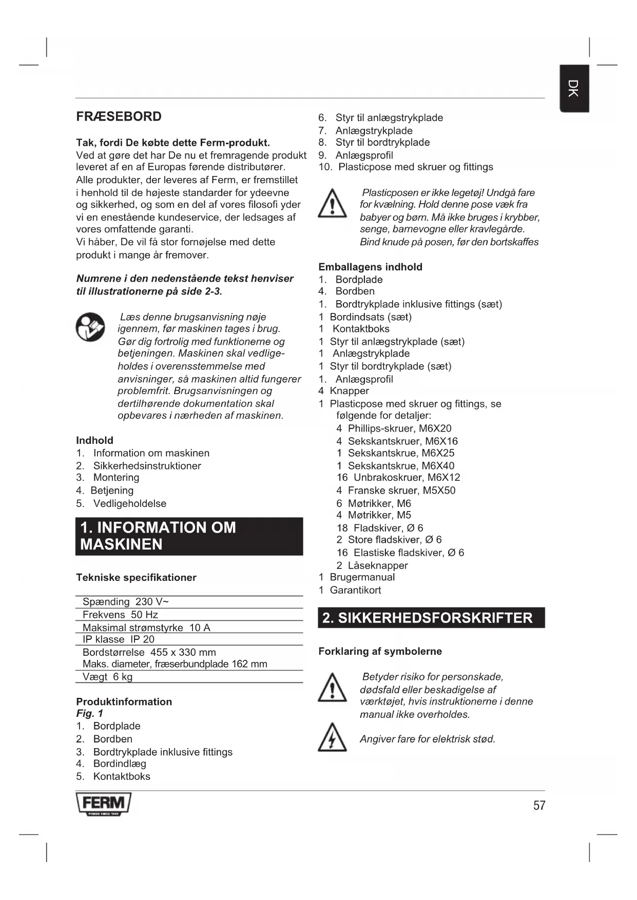 FRÆSEBORD Tak, fordi De købte dette Ferm-produkt. Ved at gøre det har De nu et fremragende produkt leveret af en af Europas førende distributører. Alle produkter, der leveres af Ferm, er fremstillet i henhold til de højeste standarder for ydeevne og sikkerhed, og som en del af vores filosofi yder vi en enestående kundeservice, der ledsages af vores omfattende garanti. Vi håber, De vil få stor fornøjelse med dette produkt i mange år fremover. Numrene i den nedenstående tekst henviser til illustrationerne på side 2-3. Læs denne brugsanvisning nøje igennem, før maskinen tages i brug. Gør dig fortrolig med funktionerne og betjeningen. Maskinen skal vedlige- holdes i overensstemmelse med anvisninger, så maskinen altid fungerer problemfrit. Brugsanvisningen og dertilhørende dokumentation skal opbevares i nærheden af maskinen. Indhold
