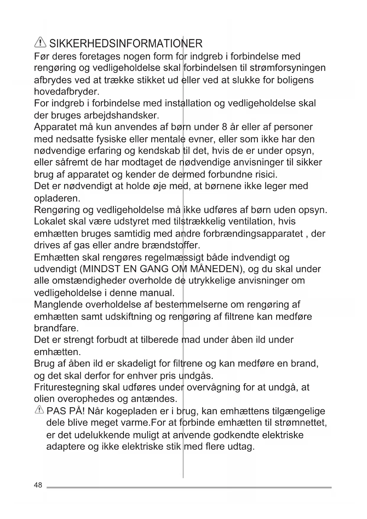 korkein (5.). VALAISTUS Tuulettimessa on LED teknologiaan perustuva valaistusjärjestelmä. LED valot takaavat parhaan mahdollisen valaistuksen,lamppujenkestoon10kertaa parempi kuin perinteisten lamppujen ja niiden avullasäästetään90%energiaa. Huomio: ÄläkatsosuoraankohtiLEDvaloa. Otayhteystekniseentukeenkunlamputon vaihdettava.48 SIKKERHEDSINFORMATIONER Før deres foretages nogen form for indgreb i forbindelse med rengøringogvedligeholdelseskalforbindelsentilstrømforsyningen afbrydesvedattrækkestikketudellervedatslukkeforboligens hovedafbryder. For indgreb i forbindelse med installation og vedligeholdelse skal derbrugesarbejdshandsker. Apparatetmåkunanvendesafbørnunder8årellerafpersoner mednedsattefysiskeellermentaleevner,ellersomikkeharden nødvendigeerfaringogkendskabtildet,hvisdeerunderopsyn, ellersåfremtdeharmodtagetdenødvendigeanvisningertilsikker brugafapparatetogkenderdedermedforbundnerisici. Deternødvendigtatholdeøjemed,atbørneneikkelegermed opladeren. Rengøringogvedligeholdelsemåikkeudføresafbørnudenopsyn. Lokaletskalværeudstyretmedtilstrækkeligventilation,hvis emhættenbrugessamtidigmedandreforbrændingsapparatet,der drivesafgasellerandrebrændstoffer. Emhættenskalrengøresregelmæssigtbådeindvendigtog udvendigt(MINDSTENGANGOMMÅNEDEN),ogduskalunder alleomstændighederoverholdedeutrykkeligeanvisningerom vedligeholdelseidennemanual. Manglende overholdelse af bestemmelserne om rengøring af emhættensamtudskiftningogrengøringafltrenekanmedføre brandfare. Deterstrengtforbudtattilberedemadunderåbenildunder emhætten. Brugafåbenilderskadeligtforltreneogkanmedføreenbrand, ogdetskalderforforenhverprisundgås. Friturestegningskaludføresunderovervågningforatundgå,at olienoverophedesogantændes. PASPÅ!Nårkogepladeneribrug,kanemhættenstilgængelige deleblivemegetvarme.Foratforbindeemhættentilstrømnettet, er det udelukkende muligt at anvende godkendte elektriske adaptereogikkeelektriskestikmedflereudtag.49 SIKKERHEDSINSTRUKTIONER Vedudskiftningafpærenmådukunanvendes dentypelyspære,dererangivetiafsnittetom vedligeholdelse/udskiftning af pære i denne manual. Paspå!Apparatetmåikketilsluttes strømforsyningen,førinstallationenerhelt fuldført. Hvadangårdeanvistetekniskeog sikkerhedsmæssige forholdsregler til udledning afrøg,skalduomhyggeligtoverholdedelokale myndighedersforskrifter. Denudsugedeluftmåikketilføresen skakt,derbrugestiludledningafrøgfra forbrændingsapparater,derfungerermedgas ellerandrebrændstoffer. Dumåikkebrugeellerefterladeemhættenuden korrektmonteredepærerforatundgåenrisiko forelektriskstød. Brug aldrig emhætten uden en korrekt monteret rist! EmhættensoverademåALDRIGanvendes somafsætningsplade,medmindredetteer udtrykkeligtangivet. Brug kun de medfølgende fastspændingsskruer til produktet i forbindelse med installationen eller –såfremtdeikkemedfølger–skalduindkøbe denkorrektetypeskruer.Brugskruerafkorrekt længde,somanførtiinstallationsvejledningen. I tvivlstilfælde bør du kontakte dit autoriserede servicecenterellerenkvalicerettekniker. PASPÅ!Hvisderikkemonteresdeskruerog fastspændingsanordninger som angivet i disse anvisninger,kanderopstårisikoforelektriske problemer. MILJØHENSYN Genbrugmaterialermedsymbolet .Anbring emballagematerialet i passende beholdere til genbrug. Hjælpmedatbeskyttemiljøetogmenneskelig sundhed samt at genbruge affald af elektriske og elektroniskeapparater.Kasserikkeapparater, derermærketmedsymbolet ,sammenmed husholdningsaffaldet.Leverproduktettilbage til din lokale genbrugsplads eller kontakt din kommune. ANVENDELSE Emhætten er udviklet til brug i den sugende udgave med ekstern udledning eller i den ltrerendeudgavemedinternrecirkulation . INSTALLERING Netspændingen skal svare til spændingen vistpåtypeskiltetinterntiemhætten.Hvis emhættenerudstyretmedetstik,skalemhætten tilsluttesenlettilgængeligstikkontakt,der er i overensstemmelse med de gældende standarder.Stikkontaktenskalogsåværelet tilgængeligefterinstalleringen.Hvisemhætten ikkeerudstyretmedetstik(direktetilslutningtil elnettet),ellerhvisstikketikkendesietområde, derogsåerlettilgængeligtefterinstalleringen, skaldermonteresentopoletafbryderkontakt ioverensstemmelsemedstandarderne,der sørgerforfuldafbrydelsefraelnettetitilfælde afforholdioverspændingskategoriIII,ogi overensstemmelse med reglerne for elektriske installationer. Obs!Undersøgaltid,atnetkableterblevet monteretrigtigt,føremhættenskredsløb tilsluttesforsyningsnettetogderudføres kontrolafkorrektfunktion.50 Minimumsafstanden mellem kogegrejets støtteoveradepåkomfuretogdennederste delafemhættenmåikkeværeunder50cmved elektriskekogeplader,ogikkeunder65cmved gasblusellerkomfurermedbådegasblusog elektriskekogeplader. Hvis gaskomfurets vejledning angiver en større afstand,skaldetteoverholdes. VEDLIGEHOLDELSE Obs! Inden der udføres nogen form for rengøring eller vedligeholdelse skal emhættenafbrydesfraelnettetvedatfjerne stikketfrastikkontakten,ellervedatafbryde hjemmetshovedafbryder. Emhættenskalrengøresjævnligtbådepå ydersidenogpåindersiden(mindstmedsamme frekvenssomforvedligeholdelseaffedtltrene). Ved rengøring skal man anvende en klud fugtet medneutrale,milderengøringsmidleriydende form. Undgåbrugafprodukterindeholdende slibemidlerBENYTALDRIGSPRIT! Pas på! Manglende overholdelse af vejledningen til rengøring af apparatet og udskiftningaffiltrenemedførerbrandfare. Derhenstillessåledestil,atinstruktionerne følges.Fabrikantenfrasigersigethvert ansvar for eventuel beskadigelse af motoren,brandeforårsagetafutilstrækkelig vedligeholdelse af apparatet eller manglende overholdelseafovenståendeinstruktioner. Fedtlter-Fedtlteretskalrengøreséngangom månedenmedmilderengøringsmidler;lteret kanogsåvaskesiopvaskemaskinevedlav temperaturogpåetkortopvaskeprogram.Ved vaskiopvaskemaskinenkanmetal-fedtlteret blivemisfarvet,mendettevilikkehavenegativ indydelsepådetsltrerendeegenskaber. Type 20 LONG LIFE - Filter med aktivt kul