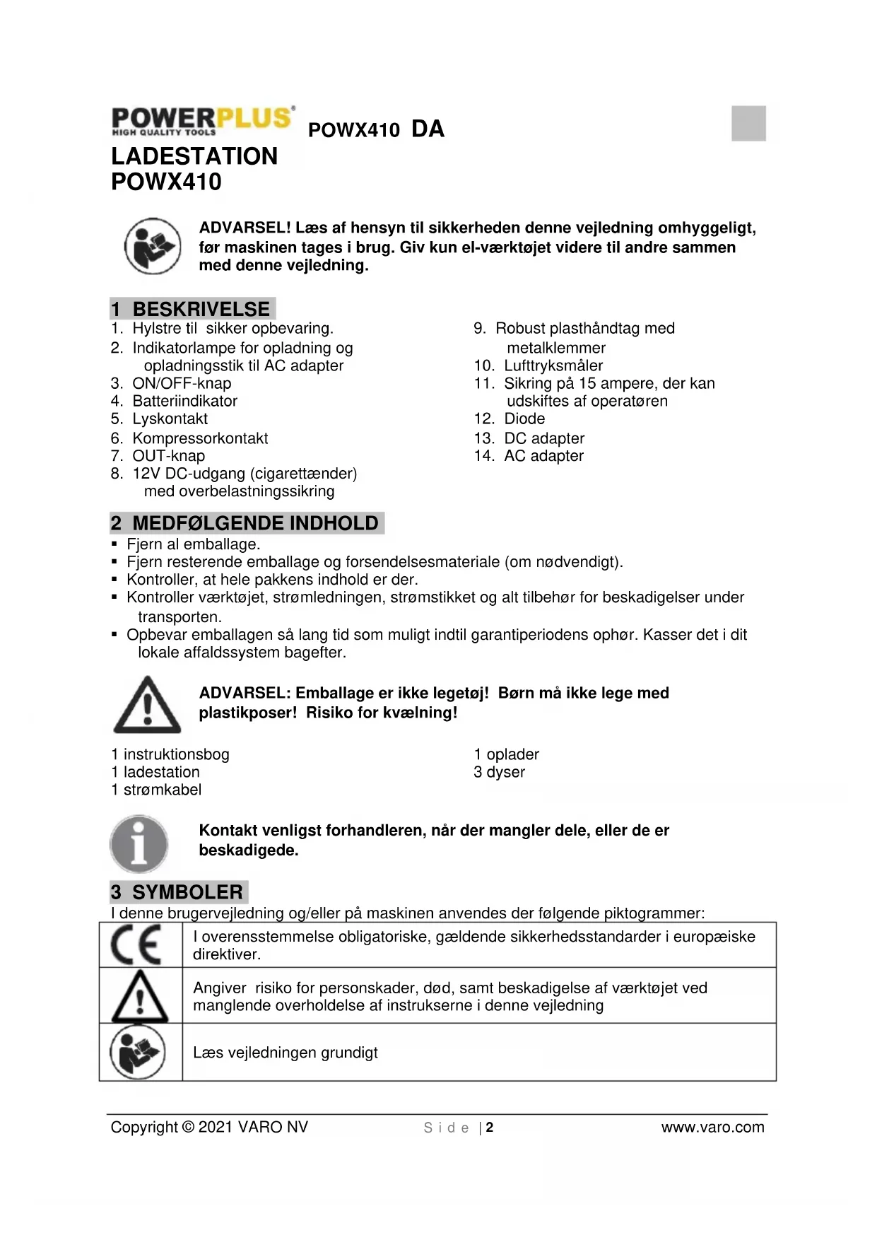Copyright © 2021 VARO NV S i d e | 2 www.varo.com LADESTATION POWX410 ADVARSEL! Læs af hensyn til sikkerheden denne vejledning omhyggeligt, før maskinen tages i brug. Giv kun el-værktøjet videre til andre sammen med denne vejledning. 1 BESKRIVELSE