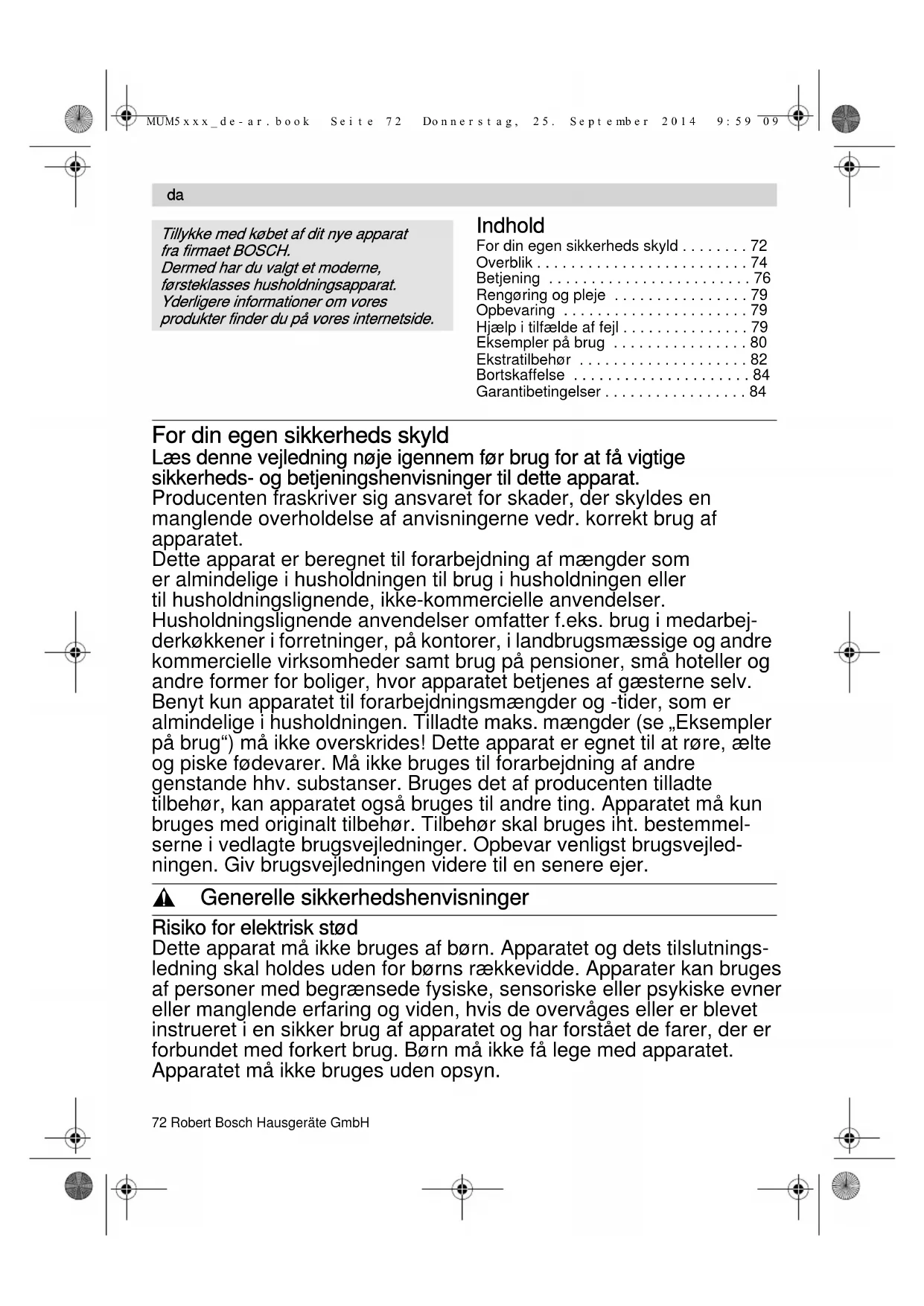 - Сijzigingen voorbehouden. MUM5xxx_de-ar.book Seite 71 Donnerstag, 25. September 2014 9:59 0972 5.960-552 A ТТТТТ (02/03) 72 Robert Bosch Hausgeräte GmbH Indhold Аor din egen sikkerheds skуld p. 72