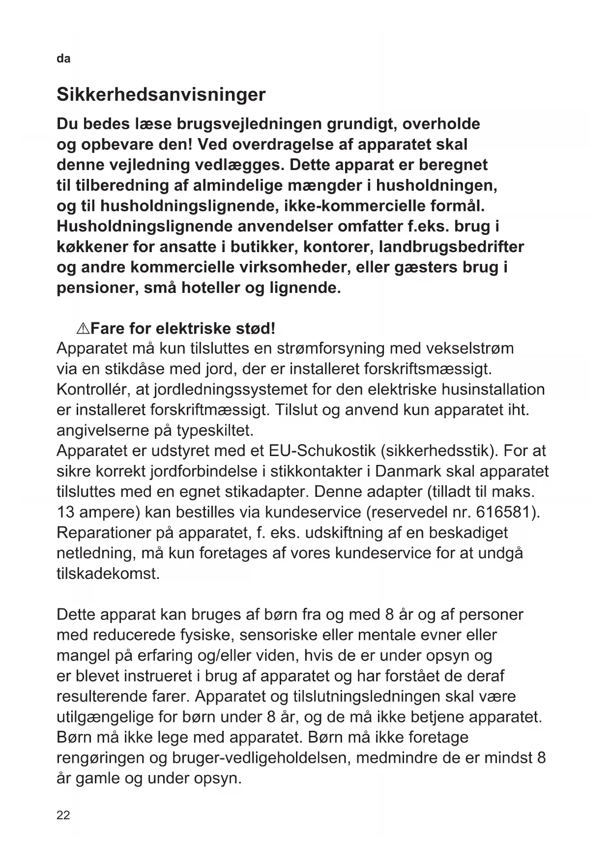 Sikkerhedsanvisninger Du bedes læse brugsvejledningen grundigt, overholde og opbevare den! Ved overdragelse af apparatet skal denne vejledning vedlægges. Dette apparat er beregnet til tilberedning af almindelige mængder i husholdningen, og til husholdningslignende, ikke-kommercielle formål. Husholdningslignende anvendelser omfatter f.eks. brug i køkkener for ansatte i butikker, kontorer, landbrugsbedrifter og andre kommercielle virksomheder, eller gæsters brug i pensioner, små hoteller og lignende. ¡ Fare for elektriske stød! Apparatet må kun tilsluttes en strømforsyning med vekselstrøm via en stikdåse med jord, der er installeret forskriftsmæssigt. Kontrollér, at jordledningssystemet for den elektriske husinstallation er installeret forskriftmæssigt. Tilslut og anvend kun apparatet iht. angivelserne på typeskiltet. Apparatet er udstyret med et EUSchukostik (sikkerhedsstik). For at sikre korrekt jordforbindelse i stikkontakter i Danmark skal apparatet tilsluttes med en egnet stikadapter. Denne adapter (tilladt til maks. 13 ampere) kan bestilles via kundeservice (reservedel nr. 616581). Reparationer på apparatet, f. eks. udskiftning af en beskadiget netledning, må kun foretages af vores kundeservice for at undgå tilskadekomst. Dette apparat kan bruges af børn fra og med 8 år og af personer med reducerede fysiske, sensoriske eller mentale evner eller mangel på erfaring og/eller viden, hvis de er under opsyn og er blevet instrueret i brug af apparatet og har forstået de deraf resulterende farer. Apparatet og tilslutningsledningen skal være utilgængelige for børn under 8 år, og de må ikke betjene apparatet. Børn må ikke lege med apparatet. Børn må ikke foretage rengøringen og brugervedligeholdelsen, medmindre de er mindst 8 år gamle og under opsyn.23