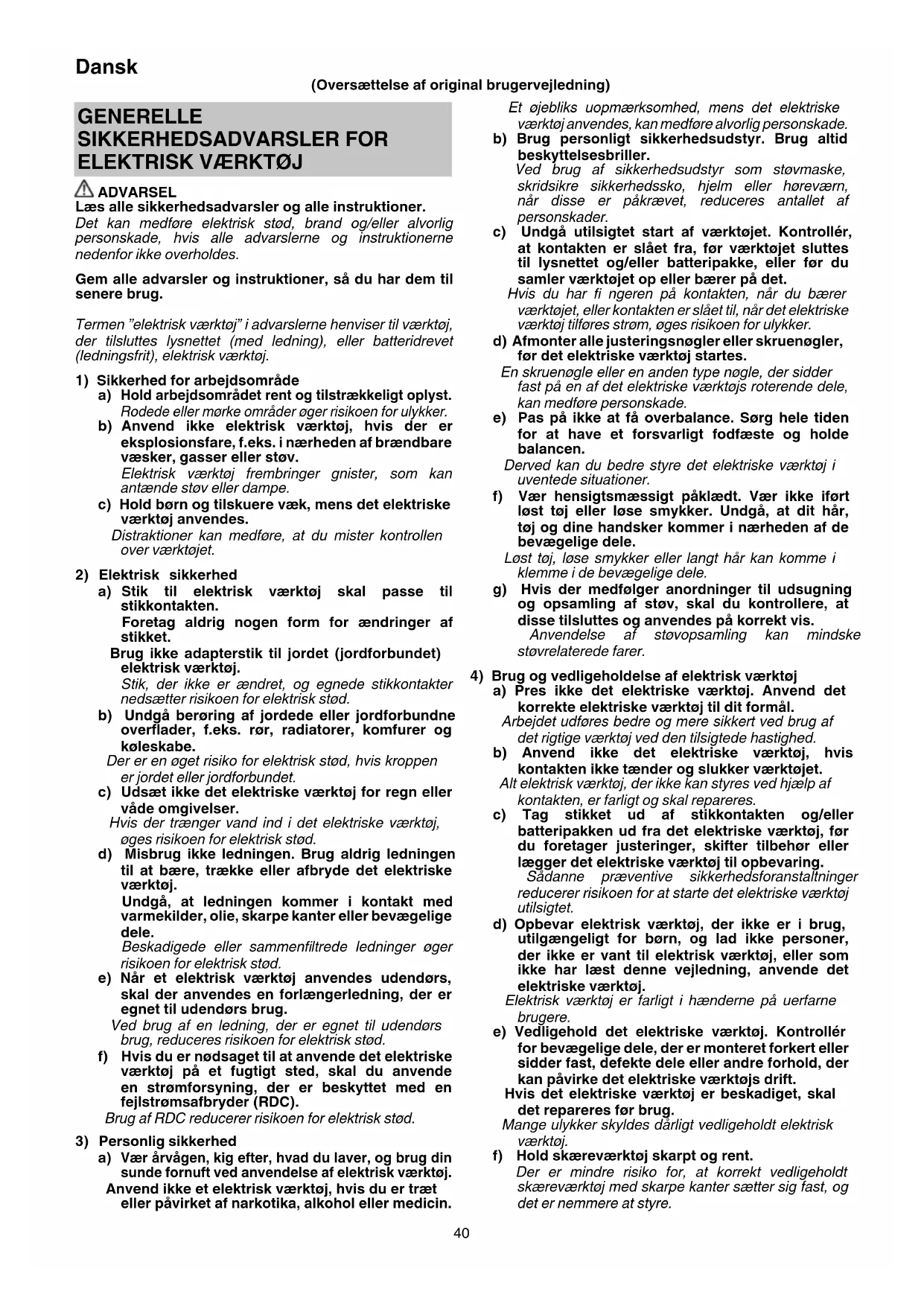 Vær årvågen, kig efter, hvad du laver, og brug din sunde fornuft ved anvendelse af elektrisk værktøj. Anvend ikke et elektrisk værktøj, hvis du er træt eller påvirket af narkotika, alkohol eller medicin. (Oversættelse af original brugervejledning) 0000BookDH40MC.indb400000BookDH40MC.indb40 2017/12/049:48:382017/12/049:48:3841 Dansk g) Anvend det elektriske værktøj, tilbehør og værktøjsbits, osv. i overensstemmelse med disse instruktioner, idet du tager højde for arbejdsforholdene og det arbejde, der skal udføres. Anvendelse af elektrisk værktøj til andre opgaver end de tilsigtede kan medføre farlige situationer.