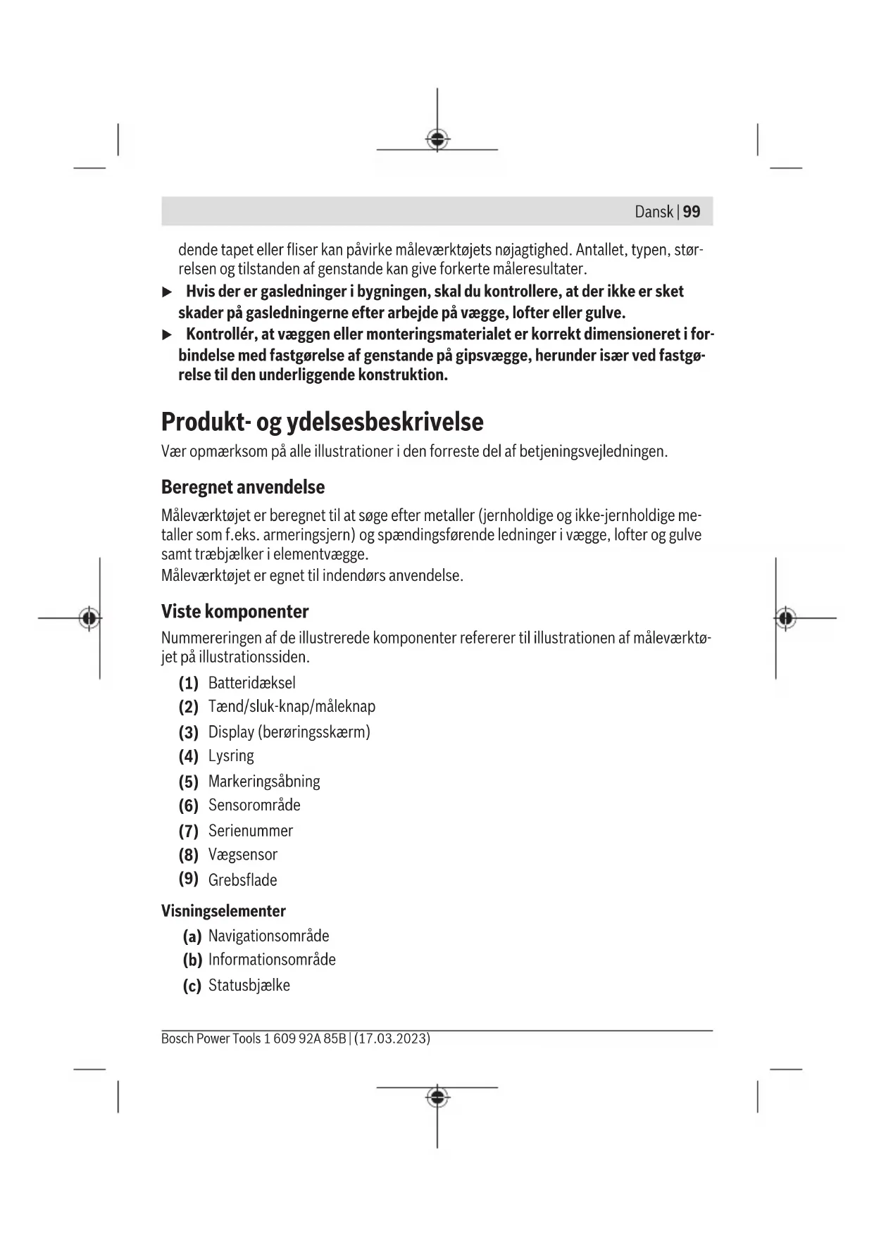 Batterier 4×1,5VLR03(AAA) Driftstid ca. 4t Vægt iht. EPTA-Procedure01:2014 0,34kg Mål(længde×bredde×højde) 255×90×56mm A) afhængigt af genstandenes driftsform, materiale og størrelse samt undergrundens materiale og tilstand B) Lavere detekteringsdybde ved ikke-spændingsførende ledninger C) svarer til to gipskartonplader D) Der forekommer kun en ikke-ledende tilsmudsning, idet der dog lejlighedsvis må forventes en midlertidig ledeevne forårsaget af tildugning. Serienummeret(7) på typeskiltet bruges til entydig identifikation af måleværktøjet. 1 609 92A 85B | (17.03.2023) Bosch Power ToolsDansk | 101 u Hvis underlaget er af dårlig beskaffenhed, kan det påvirke måleresultatets præ- cision og detekteringsdybden negativt. Montering Isætning/skift af batterier Det anbefales at bruge alkaliske manganbatterier til måleværktøjet. Brug ikke batterier med en nominel spænding på mere end 1,5V. Låget til batterirummet(1) åbnes ved at skubbe det af batterirummet i pilens retning. Isæt batterierne. Sørg i den forbindelse for, at polerne vender rigtigt som vist på indersiden af batterirum- met. Batterivisningen(f) på statusbjælken på displayet angiver den aktuelle batteristatus. Hvis visningen i siden fremkommer på statusbjælken på displayet, kan måle- værktøjet stadig bruges i 15minutter. Udskift batterierne. Udskift altid alle batterier samtidig. Brug kun batterier fra en og samme producent og med samme kapacitet. u Tag batterierne ud af måleværktøjet, hvis det ikke skal bruges i længere tid. Bat- terierne kan korrodere og aflade sig selv, hvis de bliver siddende i længere tid. Brug u Beskyt måleværktøjet mod fugt og direkte sollys. u Udsæt ikke måleværktøjet for ekstreme temperaturer eller temperatursvingnin- ger. Ved større temperatursvingninger skal måleværktøjets temperatur tilpasse sig, før det tages i brug. Ekstreme temperaturer eller temperatursvingninger kan på- virke måleværktøjets præcision og visningen på displayet. u Udsæt ikke måleværktøjet for voldsomme stød eller fald. Efter kraftige ydre på- virkninger og ved unormal funktion bør du lade en autoriseret Bosch-kundeservice kontrollere måleværktøjet. u Hold kun måleværktøjet i grebsfladerne (9), så du ikke påvirker målingen. u I sensorområdet(6) bag på måleværktøjet må der ikke placeres mærkater eller plader. Især metalplader påvirker måleresultaterne. Bær ikke handsker under målingen, og sørg for tilstrækkelig jording. Ved utilstrækkelig jordtilslutning kan registreringen af spændingsførende ledninger påvirkes. Bosch Power Tools 1 609 92A 85B | (17.03.2023)102 | Dansk Sørg for, at der ikke befinder sig apparater, der udsender stærke elektri- ske, magnetiske eller elektromagnetiske felter, i nærheden, når du måler, herunder for eksempel mobiltelefoner, laptops eller tablets. Deaktiver de pågældende funktioner på apparater, hvis stråling kan påvirke målingen, eller sluk apparaterne helt. Anvendelse af berøringsskærmen u Brug ikke måleværktøjet, hvis berøringsskærmen har synlige skader (f.eks. rid- ser i overfladen etc.). Displayet er inddelt i en statusbjælke(c) samt en berøringsskærm med informationsområde(b) og navigationsområde(a). Statusbjælken(c) viser den aktuelle indstilling af signaltonen(e), batterivisningen(f) og sidetallet(d) (ved menuer med flere sider). Måleværktøjet styres ved at berøre knapperne på berøringsskærmen. u Brug kun fingeren til at betjene berøringsskærmen. u Undgå, at berøringsskærmen kommer i kontakt med andre elektriske apparater eller vand. u Sluk måleværktøjet, når du skal rengøre berøringsskærmen. Tør snavs af med en mi- krofiberklud eller lignende. Navigering i menuen Til betjening af måleværktøjet er berøringsskærmen udstyret med følgende generelle knapper (ud over knapperne på de enkelte sprog): Knap Handling Blad til forrige side Blad til næste side Gå et menuniveau tilbage/op Åbn menuen<Indstillinger> Åbn menuen<Hjælpemenu> 1 609 92A 85B | (17.03.2023) Bosch Power ToolsDansk | 103 Ibrugtagning Tænd/sluk u Før måleværktøjet tændes skal man sikre sig, at sensorområdet(6) ikke er fug- tigt. Tør om nødvendigt måleværktøjet med en klud. u Hvis måleværktøjet udsættes for store temperaturudsving, skal måleværktøjets temperatur tilpasse sig, før det tages i brug. Når du vil tænde måleværktøjet, skal du trykke på tænd/sluk-knappen(2). Vær opmærk- som på tips til betjening af måleværktøjet. Du kan deaktivere de detaljerede henvisninger til følgende aktiveringer i undermenuen<Tips>. Når du vil slukke for måleværktøjet, skal du trykke på tænd/sluk-knappen(2). Hvis der ikke trykkes på en knap på måleværktøjet eller berøringsskærmen i ca.5minutter, slukkes måleværktøjet automatisk for at skåne batterierne. Funktionsmåde (sebilledeA) Med måleværktøjet kontrolleres underlaget i sensorområdet(6) i måleretningz indtil den maksimale detekteringsdybde. Vælg den ønskede driftstilstand. Bevæg hele tiden måleværktøjet i en lige linje langs x-aksen med et let tryk over over- fladen uden at løfte det eller ændre tryk. For at sikre en korrekt måling skal vægsensoren(8) hele tiden have kontakt med underlaget. Hold fast om måleværktøjet på grebsfladen(9), og undgå at berøre sensorområdet(6) under målingen. Hvis måleværktøjet registrerer et signal, vises det i informationsområdet(b), og lysringen(4) lyser gult. Følg de yderligere anvisninger i informationsområdet. Bemærk, at du ved at føre måleværktøjet flere gange hen over underlaget øger præcisionen af de- tekteringen. Når der findes et objekt, vises det i informationsområdet. Lysringen(4) ly- ser rødt, og der lyder en signaltone. Typen af det fundne objekt vises på displayet (afhængigt af driftstilstanden): – Strømkabel – Metalobjekt – Underkonstruktion. Hvis der ikke findes noget objekt, forbliver lysringen(4) grøn, og der er