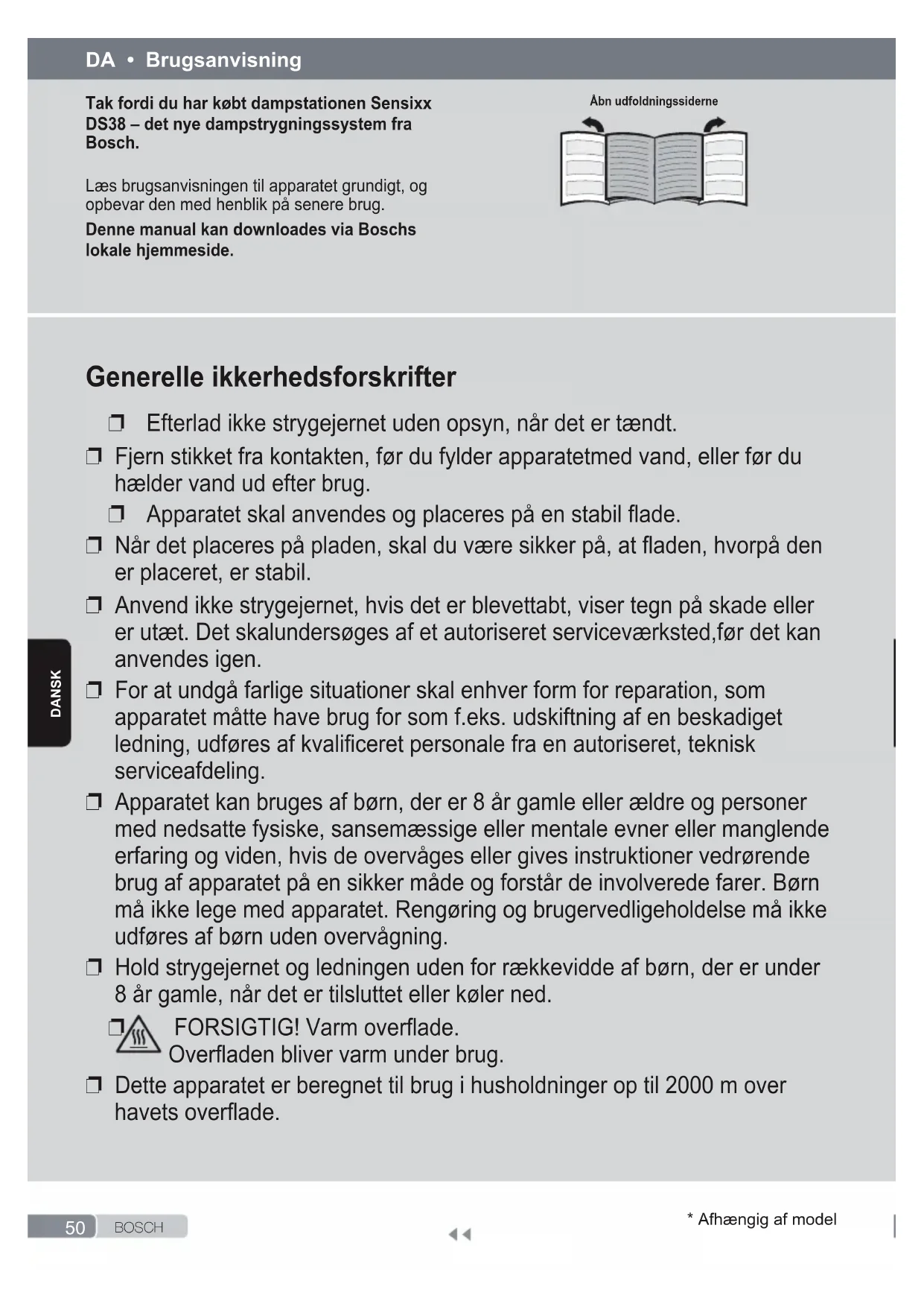 strijkijzer zal onmiddellijk ophouden met stomen. Als het bovenstaande het probleem niet oplost, neem dan contact op met een erkende technische dienst.50 B O S C H* Afhængig af modelDaNSk Tak fordi du har købt dampstationen Sensixx DS38 – det nye dampstrygningssystem fra Bosch. Læs brugsanvisningen til apparatet grundigt, og opbevar den med henblik på senere brug. Denne manual kan downloades via Boschs lokale hjemmeside. DA • Brugsanvisning Åbn udfoldningssiderne Generelle ikkerhedsforskrifter ❐ Efterlad ikke strygejernet uden opsyn, når det er tændt. ❐ Fjern stikket fra kontakten, før du fylder apparatetmed vand, eller før du hælder vand ud efter brug. ❐ Apparatet skal anvendes og placeres på en stabil ade. ❐ Når det placeres på pladen, skal du være sikker på, at aden, hvorpå den er placeret, er stabil. ❐ Anvend ikke strygejernet, hvis det er blevettabt, viser tegn på skade eller er utæt. Det skalundersøges af et autoriseret serviceværksted,før det kan anvendes igen. ❐ For at undgå farlige situationer skal enhver form for reparation, som apparatet måtte have brug for som f.eks. udskiftning af en beskadiget ledning, udføres af kvaliceret personale fra en autoriseret, teknisk serviceafdeling. ❐ Apparatet kan bruges af børn, der er 8 år gamle eller ældre og personer med nedsatte fysiske, sansemæssige eller mentale evner eller manglende erfaring og viden, hvis de overvåges eller gives instruktioner vedrørende brug af apparatet på en sikker måde og forstår de involverede farer. Børn må ikke lege med apparatet. Rengøring og brugervedligeholdelse må ikke udføres af børn uden overvågning. ❐ Hold strygejernet og ledningen uden for rækkevidde af børn, der er under 8 år gamle, når det er tilsluttet eller køler ned.