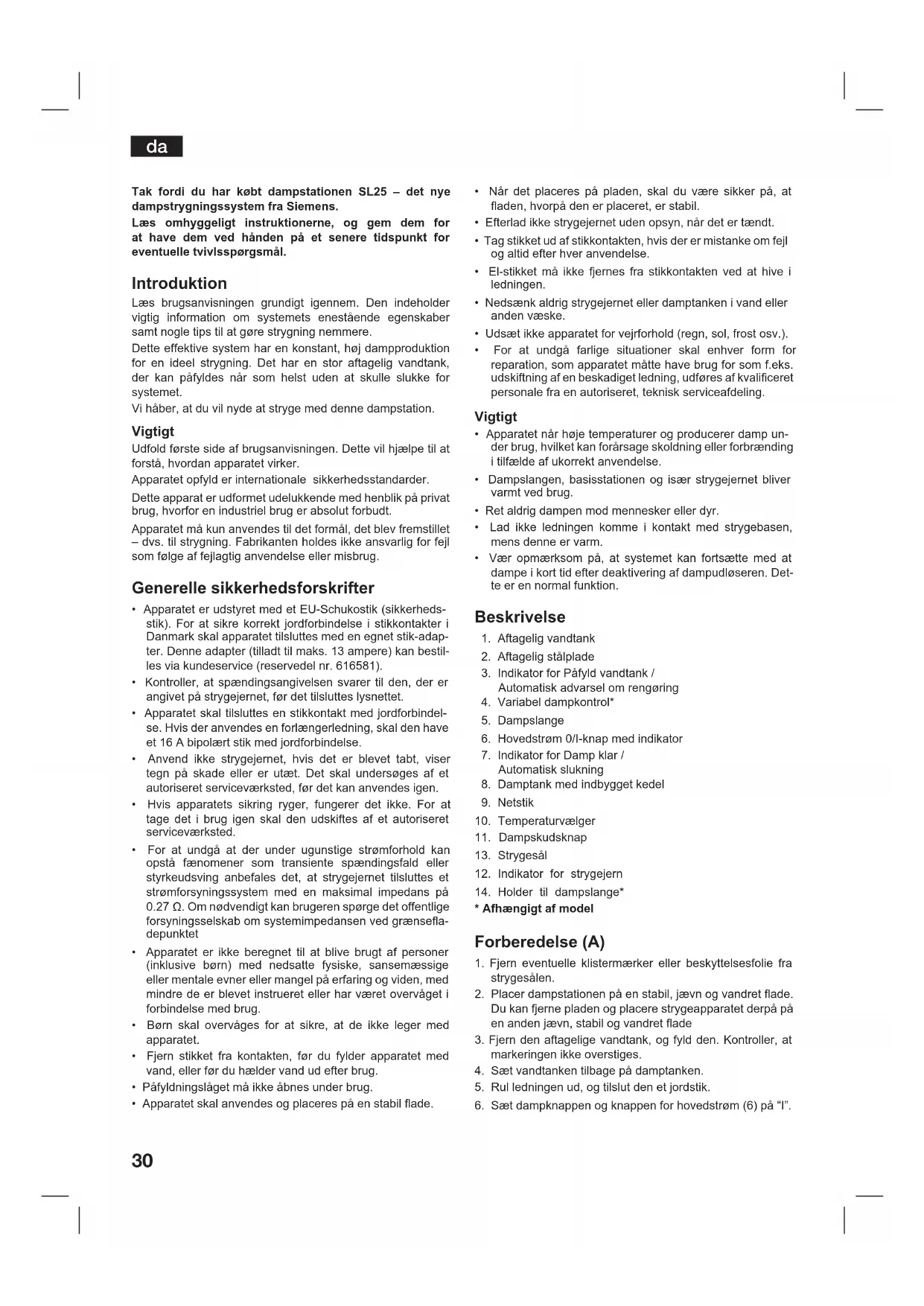 Tak fordi du har købt dampstationen SL25 – det nye dampstrygningssystem fra Siemens. Læs omhyggeligt instruktionerne, og gem dem for at have dem ved hånden på et senere tidspunkt for eventuelle tvivlsspørgsmål. Introduktion Læs brugsanvisningen grundigt igennem. Den indeholder vigtig information om systemets enestående egenskaber samt nogle tips til at gøre strygning nemmere. Dette effektive system har en konstant, høj dampproduktion for en ideel strygning. Det har en stor aftagelig vandtank, der kan påfyldes når som helst uden at skulle slukke for systemet. Vi håber, at du vil nyde at stryge med denne dampstation. Vigtigt Udfold første side af brugsanvisningen. Dette vil hjælpe til at forstå, hvordan apparatet virker. Apparatet opfyld er internationale sikkerhedsstandarder. Dette apparat er udformet udelukkende med henblik på privat brug, hvorfor en industriel brug er absolut forbudt. Apparatet må kun anvendes til det formål, det blev fremstillet – dvs. til strygning. Fabrikanten holdes ikke ansvarlig for fejl som følge af fejlagtig anvendelse eller misbrug. Generelle sikkerhedsforskrifter