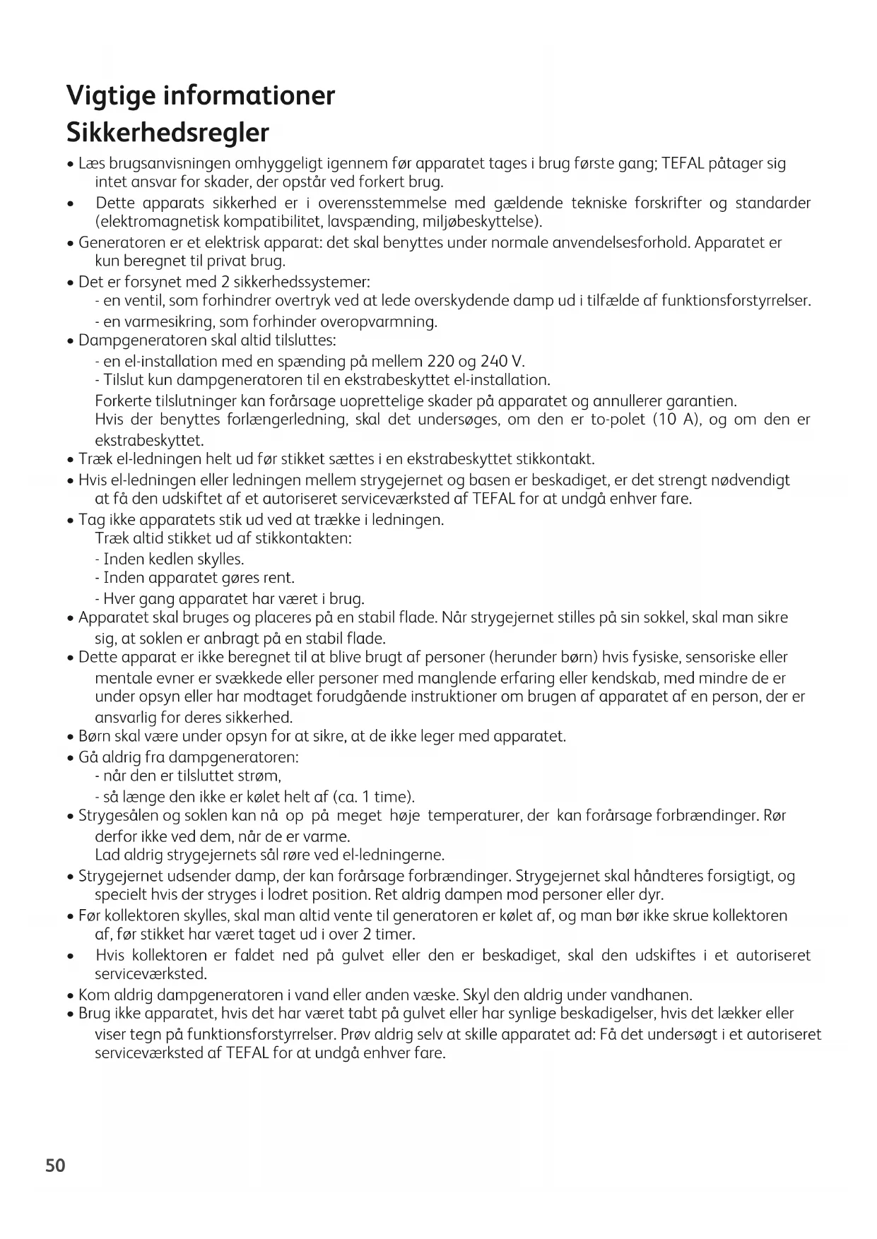 - Læs brugsanvisningen omhyggeligt igennem før apparatet tages i brug første gang; TEFAL påtager sig intet ansvar for skader, der opstår ved forkert brug.