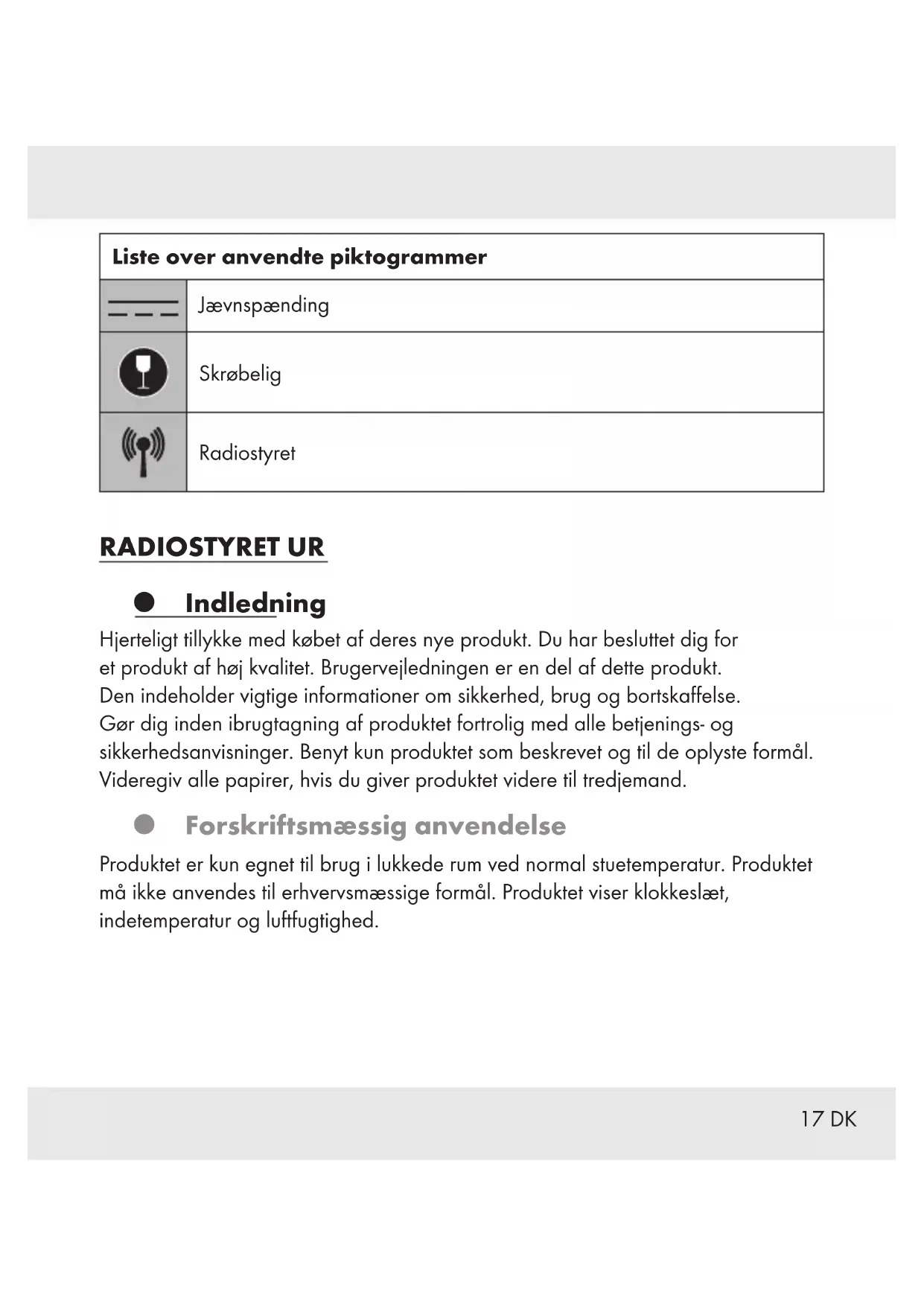 Batterirum Tekniske data Temperaturvisning: –40 til 60 °C Fugtighedsvisning: 0 til 100 % Batteritype: 1 x 1,5 V AA, LR6 Quartzur: Radiosignal til HG03895: DCF77 Radiosignal til HG03895-BS: MSF60 Frekvensbånd: 77,5 kHz (HG03895); 60 kHz (HG03895-BS) Modelnummer: HG03895: DCF RC urværk HG03895-BS: MSF RC urværk Leveringsomfang Kontrollér venligst, umiddelbart efter udpakningen, om leveringsomfanget er korrekt og at produktet og alle dele er i fejlfri stand. 1 Radiostyret ur 1 Batteri 1 x 1,5 V AA, LR6 (forinstalleret) 1 Betjeningsvejledning19 DK Sikkerhedshenvisninger ADVARSEL! Læs alle sikkerhedshenvisninger og vejledninger. Hvis sikkerhedshenvisninger og vejledninger ikke overholdes er der fare for brand og/ eller alvorlige kvæstelser. Almindelige sikkerhedshenvisninger