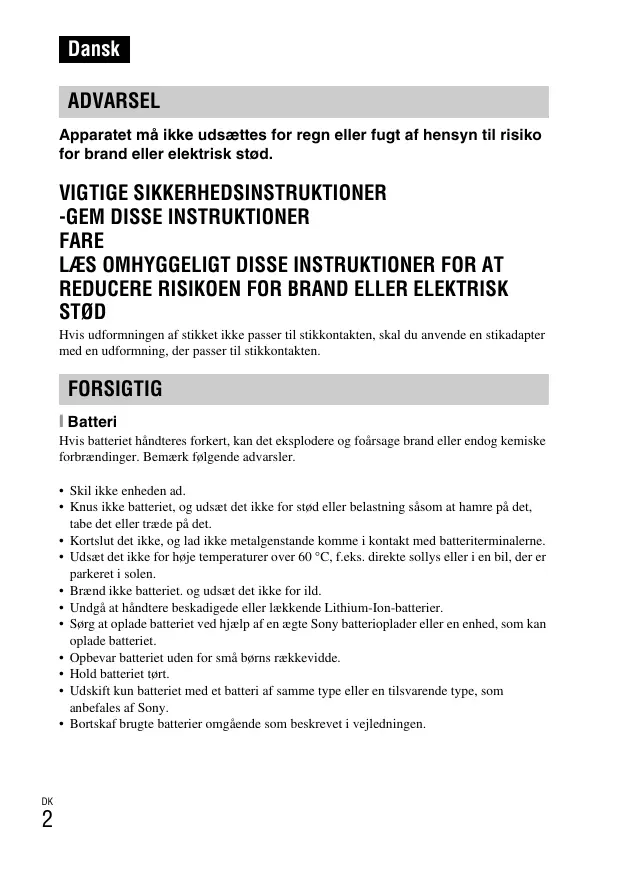STØD Hvis udformningen af stikket ikke passer til stikkontakten, skal du anvende en stikadapter med en udformning, der passer til stikkontakten. FORSIGTIG [ Batteri Hvis batteriet håndteres forkert, kan det eksplodere og foårsage brand eller endog kemiske forbrændinger. Bemærk følgende advarsler.