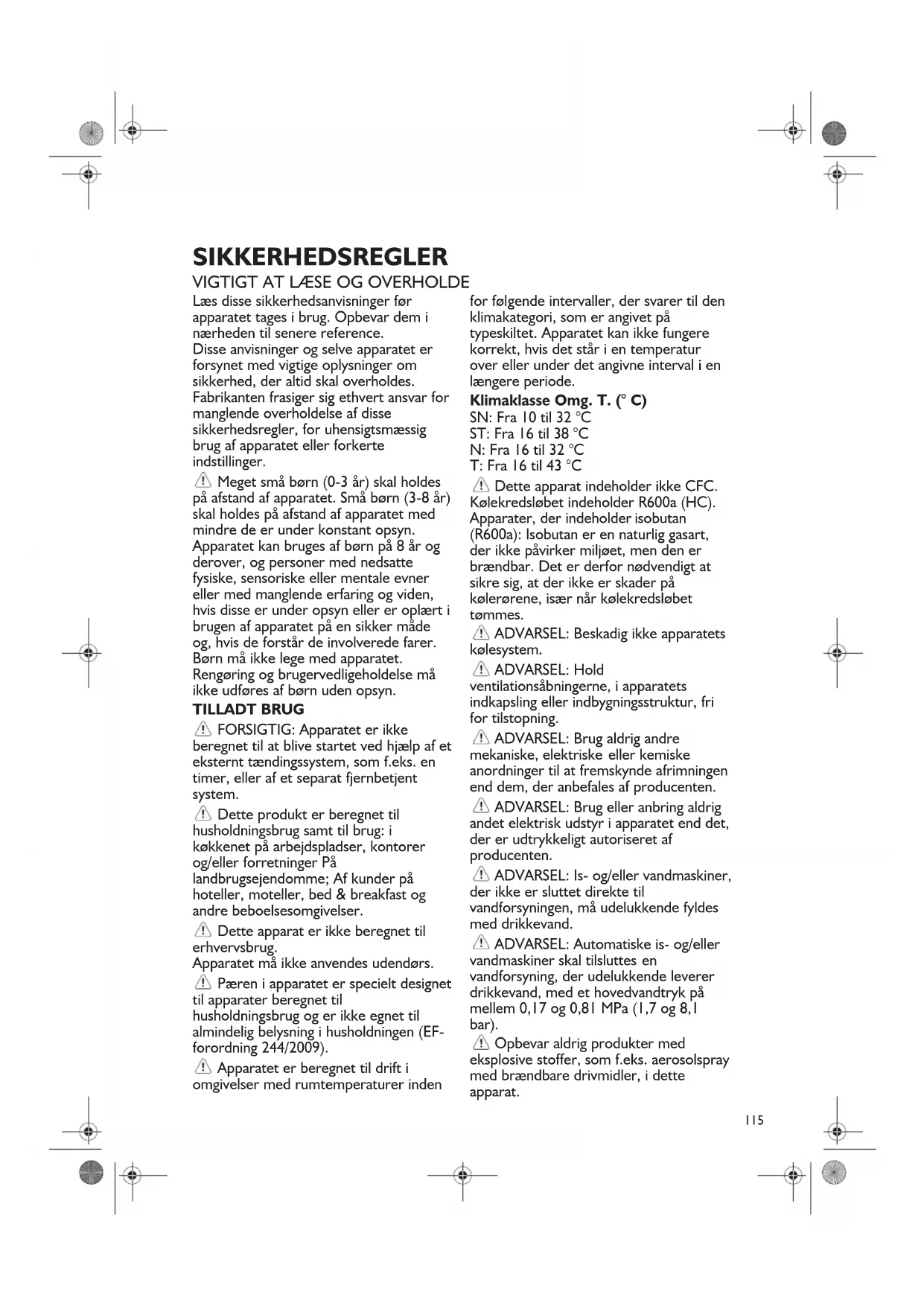 Læs disse sikkerhedsanvisninger før apparatet tages i brug. Opbevar dem i nærheden til senere reference. Disse anvisninger og selve apparatet er forsynet med vigtige oplysninger om sikkerhed, der altid skal overholdes. Fabrikanten frasiger sig ethvert ansvar for manglende overholdelse af disse sikkerhedsregler, for uhensigtsmæssig brug af apparatet eller forkerte indstillinger. Meget små børn (0-3 år) skal holdes på afstand af apparatet. Små børn (3-8 år) skal holdes på afstand af apparatet med mindre de er under konstant opsyn. Apparatet kan bruges af børn på 8 år og derover, og personer med nedsatte fysiske, sensoriske eller mentale evner eller med manglende erfaring og viden, hvis disse er under opsyn eller er oplært i brugen af apparatet på en sikker måde og, hvis de forstår de involverede farer. Børn må ikke lege med apparatet. Rengøring og brugervedligeholdelse må ikke udføres af børn uden opsyn. TILLADT BRUG FORSIGTIG: Apparatet er ikke beregnet til at blive startet ved hjælp af et eksternt tændingssystem, som f.eks. en timer, eller af et separat fjernbetjent system. Dette produkt er beregnet til husholdningsbrug samt til brug: i køkkenet på arbejdspladser, kontorer og/eller forretninger På landbrugsejendomme ; Af kunder på hoteller, moteller, bed & breakfast og andre beboelsesomgivelser. Dette apparat er ikke beregnet til erhvervsbrug. Apparatet må ikke anvendes udendørs. Pæren i apparatet er specielt designet til apparater beregnet til husholdningsbrug og er ikke egnet til almindelig belysning i husholdningen (EF- forordning 244/2009). Apparatet er beregnet til drift i omgivelser med rumtemperaturer inden for føl gende intervaller, der svarer til den klimakategori, som er angivet på typeskiltet. Apparatet kan ikke fungere korrekt, hvis det står i en temperatur over eller under det angivne interval i en længere periode. Klimaklasse Omg. T. (° C) SN: Fra 10 til 32 °C ST: Fra 16 til 38 °C N: Fra 16 til 32 °C T: Fra 16 til 43 °C Dette apparat indeholder ikke CFC. Kølekredsløbet indeholder R600a (HC). Apparater, der indeholder isobutan (R600a): Isobutan er en naturlig gasart, der ikke påvirker miljøet, men den er brændbar. Det er derfor nødvendigt at sikre sig, at der ikke er skader på kølerørene, især når kølekredsløbet tømmes. ADVARSEL: Beskadig ikke apparatets kølesystem. ADVARSEL: Hold ventilationsåbningerne, i apparatets indkapsling eller indbygningsstruktur, fri for tilstopning. ADVARSEL: Brug aldrig andre mekaniske, elektriske eller kemiske anordninger til at fremskynde afrimningen end dem, der anbefales af producenten. ADVARSEL: Brug eller anbring aldrig andet elektrisk udstyr i apparatet end det, der er udtrykkeligt autoriseret af producenten. ADVARSEL: Is- og/eller vandmaskiner, der ikke er sluttet direkte til vandforsyningen, må udelukkende fyldes med drikkevand. ADVARSEL: Automatiske is- og/eller vandmaskiner skal tilsluttes