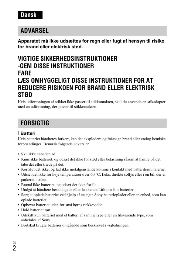 STØD Hvis udformningen af stikket ikke passer til stikkontakten, skal du anvende en stikadapter med en udformning, der passer til stikkontakten. FORSIGTIG [ Batteri Hvis batteriet håndteres forkert, kan det eksplodere og foårsage brand eller endog kemiske forbrændinger. Bemærk følgende advarsler.