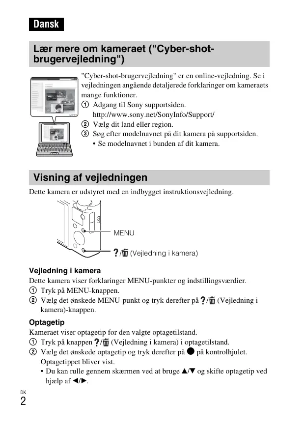 Dansk Lær mere om kameraet ("Cyber-shotbrugervejledning") "Cyber-shot-brugervejledning" er en online-vejledning. Se i vejledningen angående detaljerede forklaringer om kameraets mange funktioner. 1 Adgang til Sony supportsiden. http://www.sony.net/SonyInfo/Support/ 2 Vælg dit land eller region. 3 Søg efter modelnavnet på dit kamera på supportsiden.