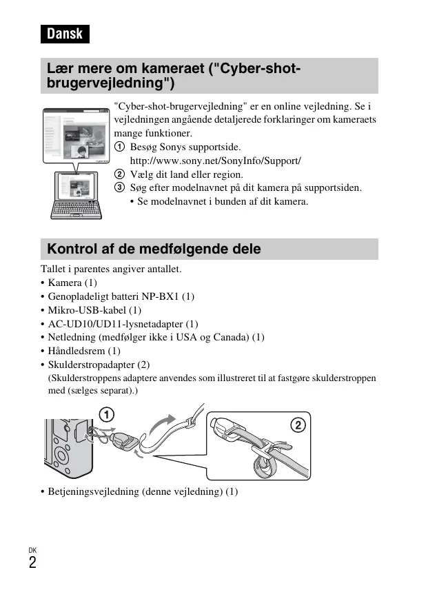 Dansk Lær mere om kameraet ("Cyber-shotbrugervejledning") "Cyber-shot-brugervejledning" er en online vejledning. Se i vejledningen angående detaljerede forklaringer om kameraets mange funktioner. 1 Besøg Sonys supportside. http://www.sony.net/SonyInfo/Support/ 2 Vælg dit land eller region. 3 Søg efter modelnavnet på dit kamera på supportsiden.