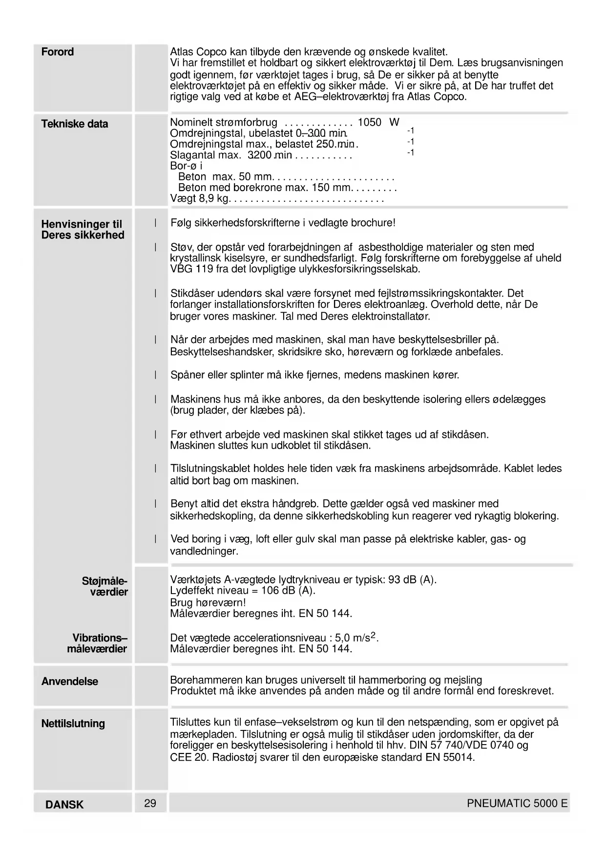 Måleværdier beregnes iht. EN 50 144. Borehammeren kan bruges universelt til hammerboring og mejsling Produktet må ikke anvendes på anden måde og til andre formål end foreskrevet. Tilsluttes kun til enfase–vekselstrøm og kun til den netspænding, som er opgivet på mærkepladen. Tilslutning er også mulig til stikdåser uden jordomskifter, da der foreligger en beskyttelsesisolering i henhold til hhv. DIN 57 740/VDE 0740 og CEE 20. Radiostøj svarer til den europæiske standard EN 55014. Forord Tekniske data Henvisninger til Deres sikkerhed Støjmåle- værdier Vibrations– måleværdier Anvendelse Nettilslutning30 DANSK PNEUMATIC 5000 E Det nødvendige slag til hammerboring i sten frembringes af et pneumatikslagværk. Ligesom man slår med en hammer på en traditionel mejsel, slår en nittedriver direkte på den aksialt bevægelige mejsel. Den elektriske motor bevæger via vippedrift –> stempel –>flyvestempel nittedriveren frem og tilbage. Mellem stempel og flyvestempel befinder der sig en luftpude (derfor ”pneumatikslagværk”). Således opnår man en stor slagelasticitet og et tilbageslagsfrit arbejde. Boreydelsen er ikke afhængig af løftetrykket. Indkobling: Der trykkes på kontakten Udkobling: kontakten slippes Omdrejningstallet kan indstilles trinløst alt efter tryk på ind–/udkobler. Den pneumatiske borehammers funktion Kort beskrivelse Afbryderkontakt Indbygget sikkerhedskobling forhindrer, at maskinen drejer med, når boret sidder fast. Ergonomisk udformet motorhus med Softgreb, der hindrer ømme og trætte muskler og led. Antivibrationssystem AVS Gear-motorenheden er frakoblet håndgrebene, dæmpningselementer absorberer vibraioner fra begge håndgreb ved hamring og mejsling. Gearskifte til omkobling mellem hammerboring og mejsling. Støttegreb med indbygget dybdestop. Afbryderkontakt aktiveres ved til– og frakobling af maskinen og til trinløs elektronisk hastighedsregulering. Sideholder til ekstra-håndgreb. Til boring i opad– eller nedadgående retning kan det ekstra-håndgreb også fastgøres på siden af huset. Ændringer: Tekst, billede og data svarer til den tekniske udvikling på trykketidspunktet. Der tages forbehold for ændringer som følge af videreudvikling af vore produkter. Borepatron til værktøjer fastlåses med SDS–max adapter – værktøjer fastlåses automatisk efter isætning.31 DANSK PNEUMATIC 5000 E Før ethvert arbejde ved maskinen skal stikket tages ud af stikdåsen. I hammerborepatronen kan følgende arbejdsværktøjer monteres med SDS-max-skaft: - Hammerbor til beton og sten - Spidsmejsel, Fladmejsel, Hulmejsel Brug kun værktøjer med SDS-max-skaft!