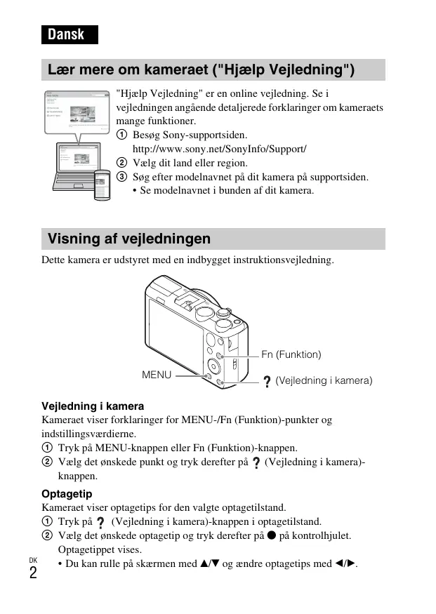 Dansk Lær mere om kameraet ("Hjælp Vejledning") "Hjælp Vejledning" er en online vejledning. Se i vejledningen angående detaljerede forklaringer om kameraets mange funktioner. 1 Besøg Sony-supportsiden. http://www.sony.net/SonyInfo/Support/ 2 Vælg dit land eller region. 3 Søg efter modelnavnet på dit kamera på supportsiden.