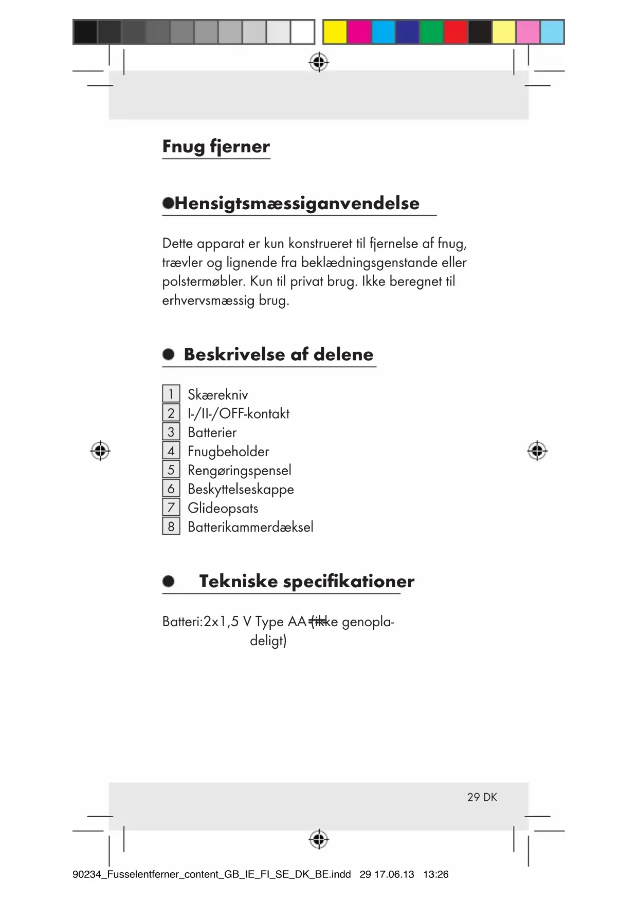 Pust fnugrester, tørres af eller fjernes med vedlagte rengø- ringspensel. Bortskaffelse Indpakningen består af miljøvenlige materialer, der kan bortskaffes på de lokale genbrugscentre. For miljøets skyld må produktet aldrig smides ud sammen med husholdningsaf- faldet, når det er udtjent, men skal afleveres til miljøvenlig bortskaffelse. Informationer 90234_Fusselentferner_content_GB_IE_FI_SE_DK_BE.indd 33 17.06.13 13:2634 DK omkring opsamlingssteder for affald og deres åbningstider kan De få hos deres lokale myndighed. Defekte eller brugte baterier skal genbruges, iflg. retningslinje 2006/66/EC. Batterierne og / eller apparatet returneres over et indsamlingspunkt.
