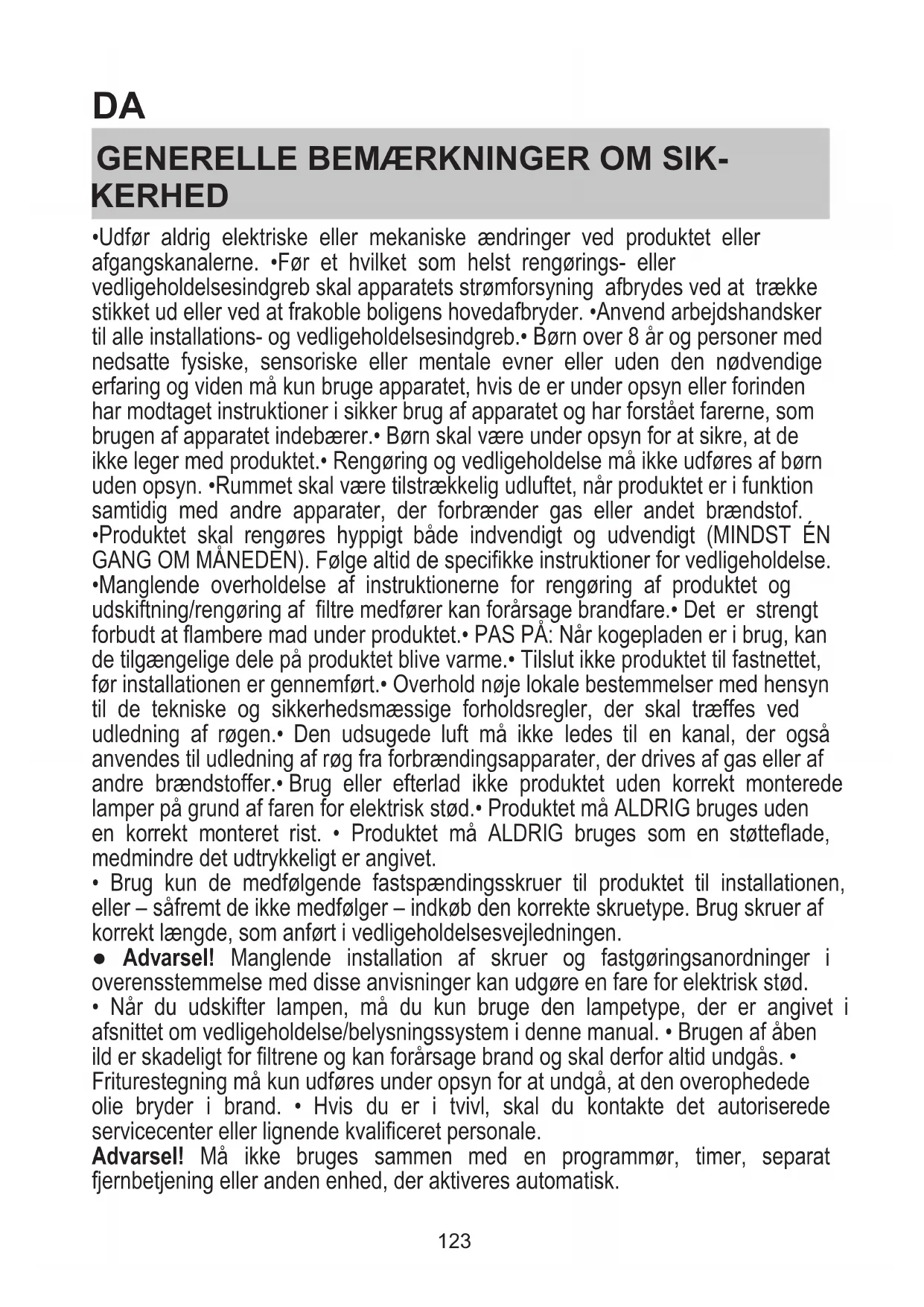 - Udfør aldrig elektriske eller mekaniske ændringer ved produktet eller afgangskanalerne. •Før et hvilket som helst rengørings- eller vedligeholdelsesindgreb skal apparatets strømforsyning afbrydes ved at trække stikket ud eller ved at frakoble boligens hovedafbryder. •Anvend arbejdshandsker til alle installations- og vedligeholdelsesindgreb.• Børn over 8 år og personer med nedsatte fysiske, sensoriske eller mentale evner eller uden den nødvendige erfaring og viden må kun bruge apparatet, hvis de er under opsyn eller forinden har modtaget instruktioner i sikker brug af apparatet og har forstået farerne, som brugen af apparatet indebærer.• Børn skal være under opsyn for at sikre, at de ikke leger med produktet.• Rengøring og vedligeholdelse må ikke udføres af børn uden opsyn. •Rummet skal være tilstrækkelig udluftet, når produktet er i funktion samtidig med andre apparater, der forbrænder gas eller andet brændstof.