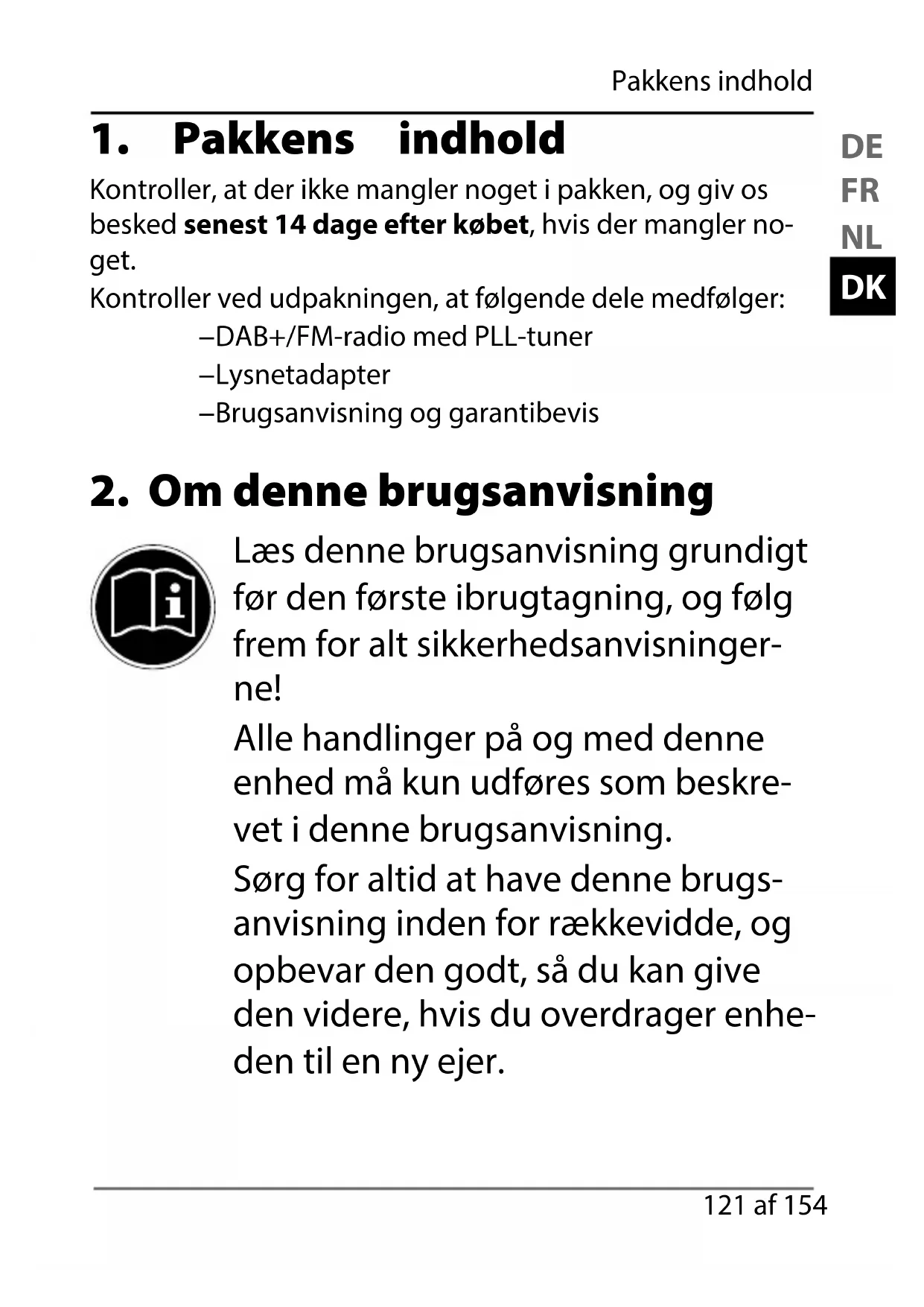Kontroller, at der ikke mangler noget i pakken, og giv os besked senest 14 dage efter købet, hvis der mangler no- get. Kontroller ved udpakningen, at følgende dele medfølger: − DAB+/FM-radio med PLL-tuner − Lysnetadapter − Brugsanvisning og garantibevis