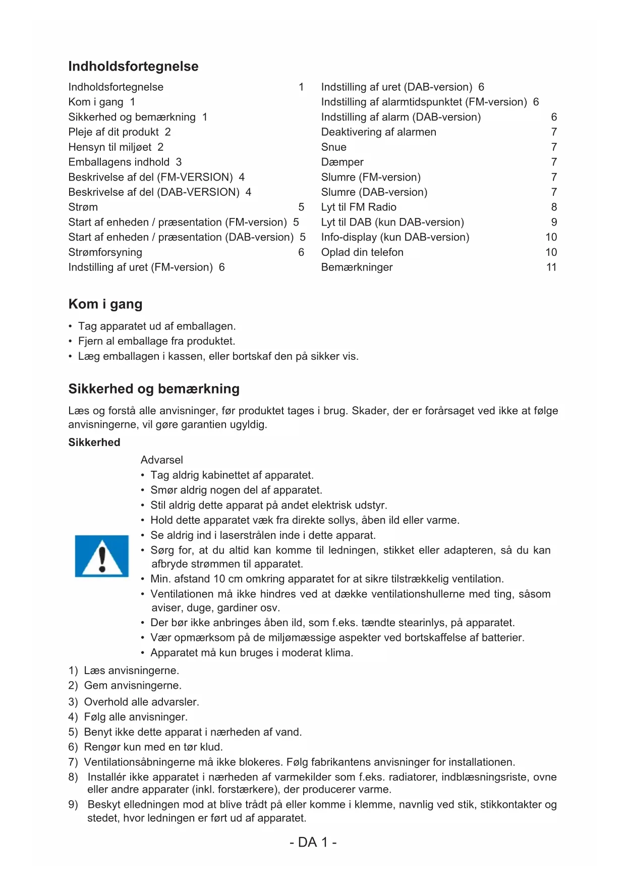 stedet, hvor ledningen er ført ud af apparatet. Indholdsfortegnelse Indholdsfortegnelse 1 Kom i gang 1 Sikkerhed og bemærkning 1 Pleje af dit produkt 2 Hensyn til miljøet 2 Emballagens indhold 3 Beskrivelse af del (FM-VERSION) 4 Beskrivelse af del (DAB-VERSION) 4 Strøm 5 Start af enheden / præsentation (FM-version) 5 Start af enheden / præsentation (DAB-version) 5 Strømforsyning 6 Indstilling af uret (FM-version) 6 Indstilling af uret (DAB-version) 6 Indstilling af alarmtidspunktet (FM-version) 6 Indstilling af alarm (DAB-version) 6 Deaktivering af alarmen 7 Snue 7 Dæmper 7 Slumre (FM-version) 7 Slumre (DAB-version) 7 Lyt til FM Radio 8 Lyt til DAB (kun DAB-version) 9 Info-display (kun DAB-version) 10 Oplad din telefon 10 Bemærkninger: 11- DA 2 -